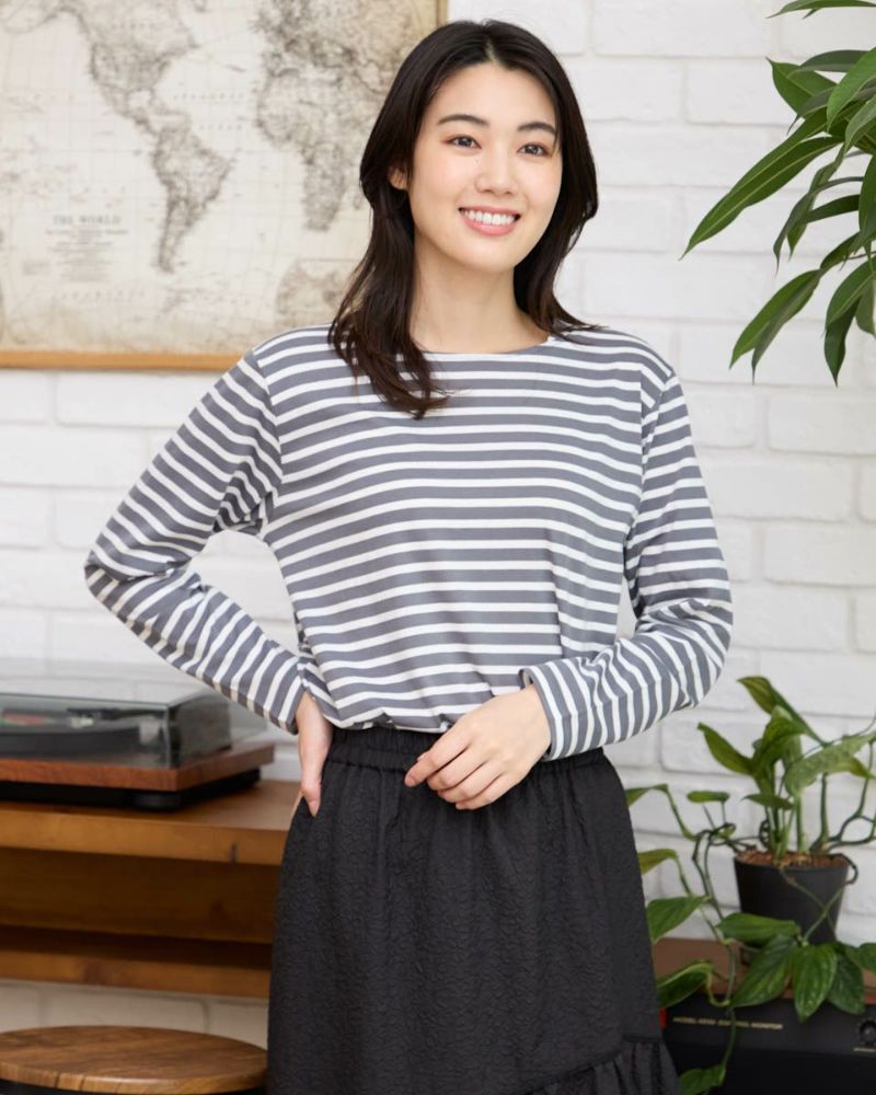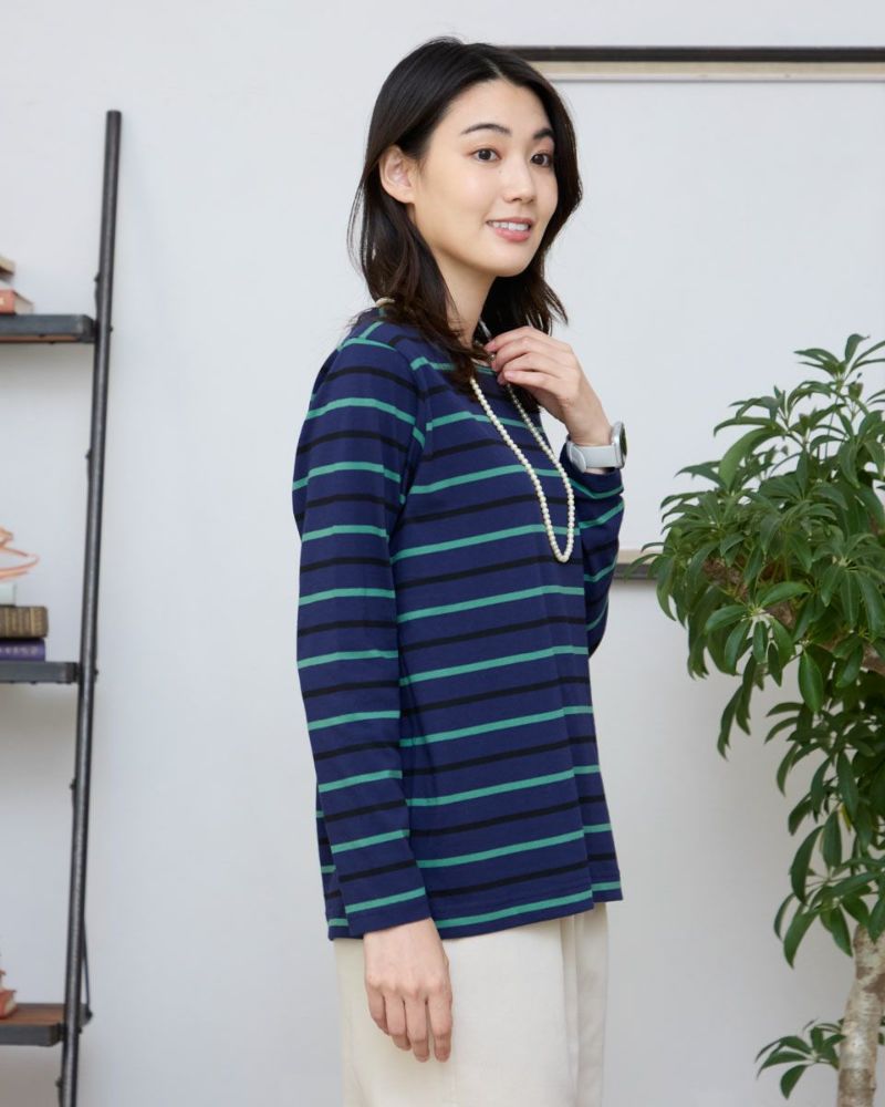 やわらかく扱いやすいTC天竺素材を使った、ボーダー柄の長袖Tシャツ。ベーシックなセットインスリーブで着やすく、1枚でも重ね着でも活躍します。 モデル身長: 166 cm 着用サイズ: M サイズ Golden Bear QUEEN SIZE(Ladies' 大きいサイズ ) カットソー (Ladies') 同デザイン通常サイズはこちら