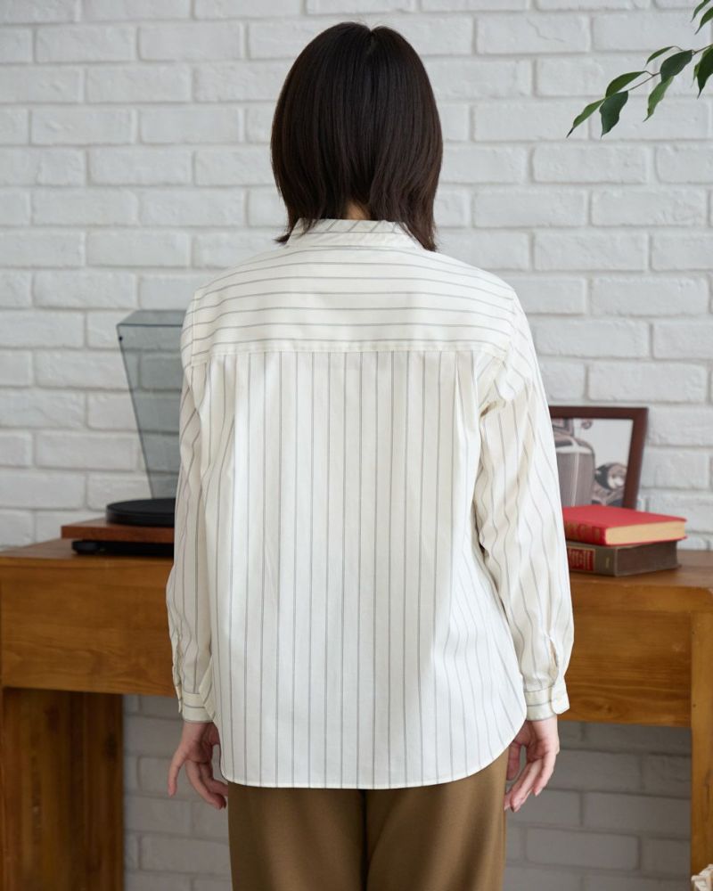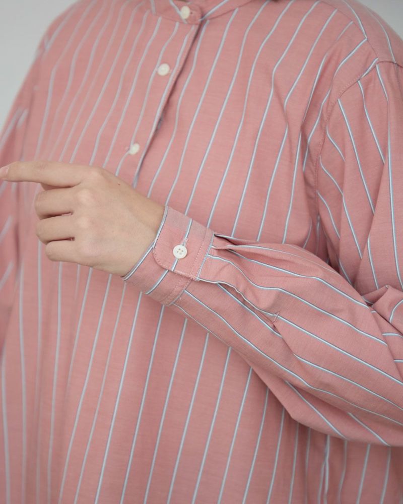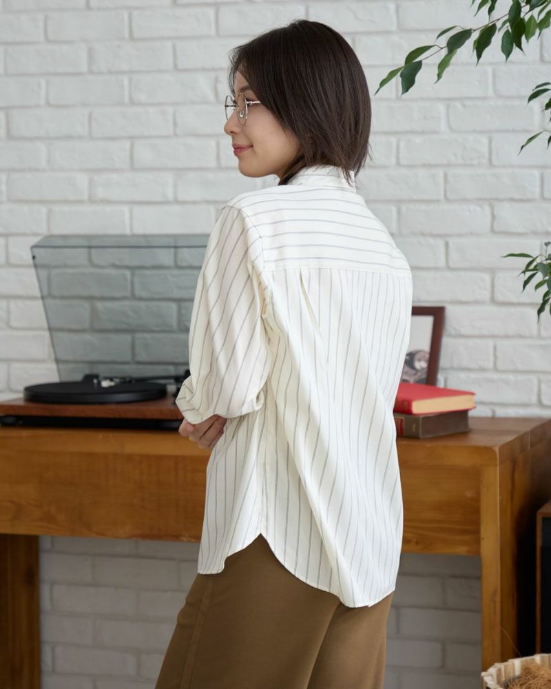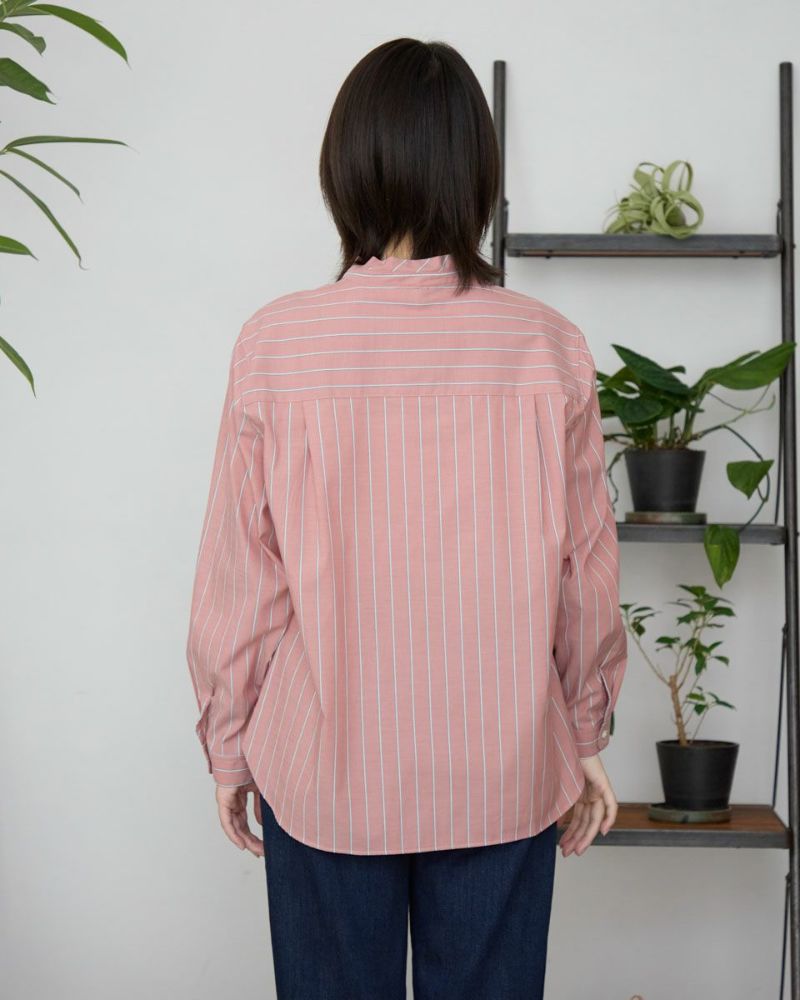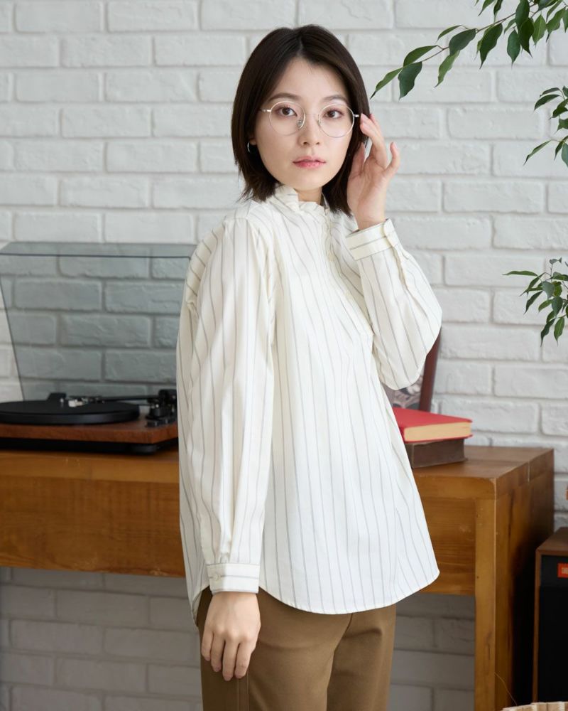 目の詰まったカジュアル過ぎない素材を使用したプルオーバーブラウスです。ひねりの効いたスタンドカラーがすっきりとクリーンな印象です。1枚でシンプルに着用してもサマになる1枚です。 モデル身長: 162 cm 着用サイズ: M サイズ Golden Bear QUEEN SIZE(Ladies' 大きいサイズ ) ブラウス (Ladies') 同デザイン通常サイズはこちら