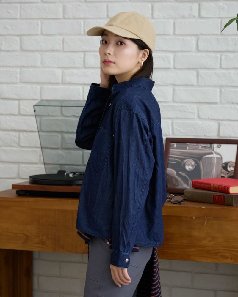 ショート丈のデニムシャツです。柔らかい素材でちょっとした羽織としても使いやすいアイテムです。カジュアルすぎないメタル釦がポイントです。ボリュームのあるボトムスと合わせるスタイリングがおすすめです。 モデル身長: 162 cm 着用サイズ: M サイズ Golden Bear QUEEN SIZE(Ladies' 大きいサイズ ) ブラウス (Ladies') 同デザイン通常サイズはこちら