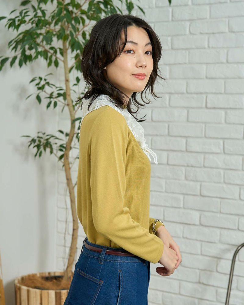 正面にリブ素材を使用、後身頃と袖には程よい厚みのダンボール素材を使用したカットソー。リブ素材のカットソーですが体のラインが強調されるのを防ぎつつ、コーディネートを楽しめるアイテムにしています。襟は女性らしいボトルネックのメロー仕上げで、繊細なニュアンスをプラス。デイリーからオフィススタイルまで幅広く活躍します。