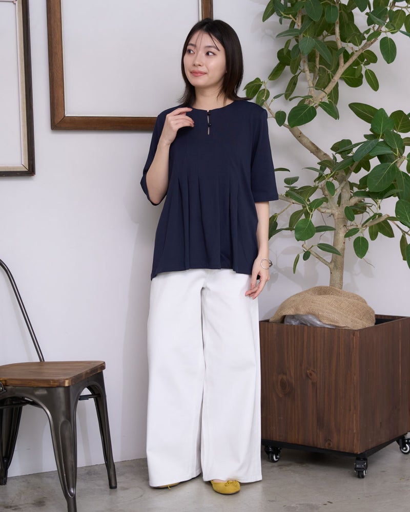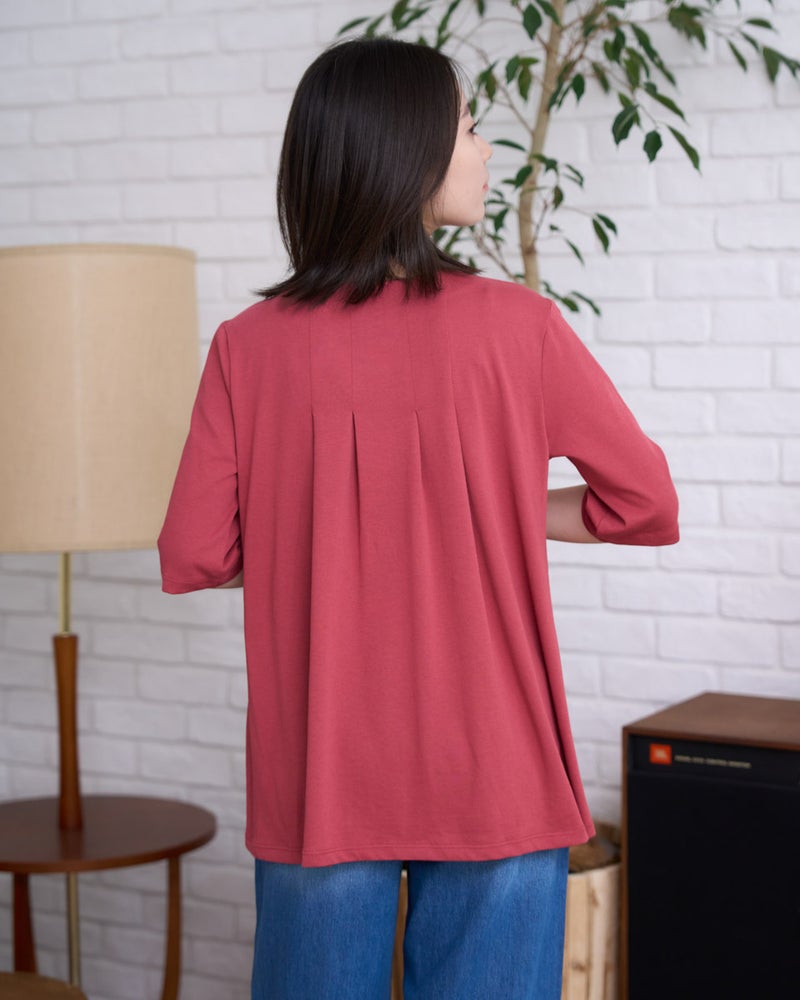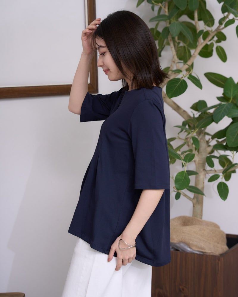 フロントに施したタックデザインが、シンプルながらも華やかな印象を与えるカットソー。立体感のあるシルエットが自然なドレープを生み出し、気になるボディラインをさりげなくカバーします。やわらかな肌触りで着心地も快適。オンにもオフにも着回しやすく、パンツにもスカートにも合わせやすい万能トップスです。