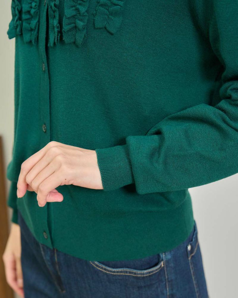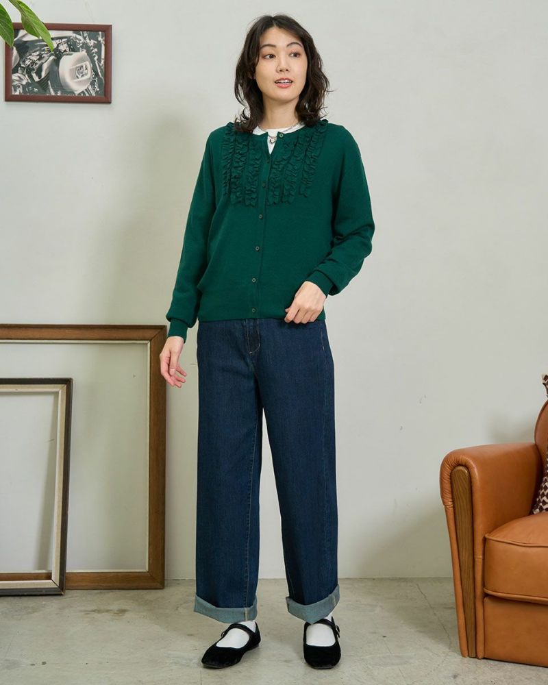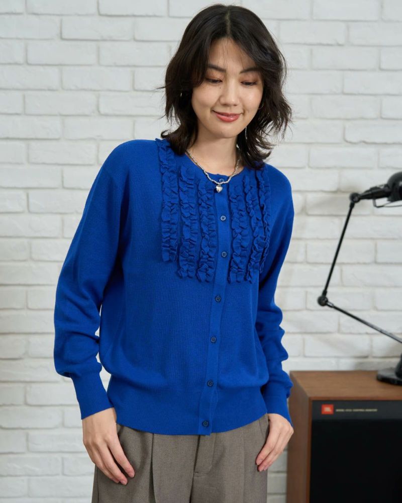 胸元にあしらったフリルがシンプルなカーディガンに彩りをプラス。少し膨らみのある編み地で1枚で着こなせるよう仕上げました。デニムやカジュアルアイテムと合わせるのがおすすめです。