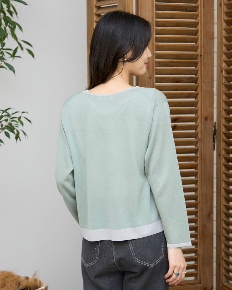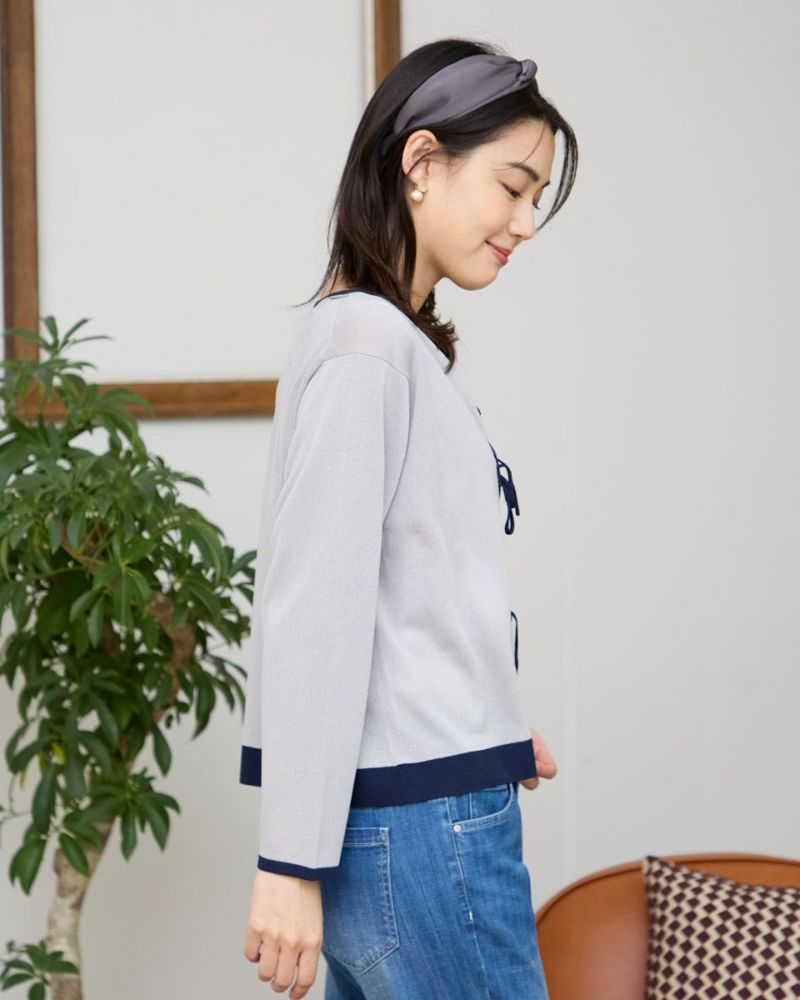 ほどよいシャリみとツヤ感があるハイゲージの編地はキレイめな表情が魅力。長袖に設定したカーディガンですが毛羽感も無いため熱がこもらずサラッと肌当たりも涼やか。配色のトリミングとフロントのリボン使いがアイキャッチになる1着。セットインスリーブできちんとした印象もあるためオフィスや学校行事での着用もおすすめ。フロントのリボンは結んでポイントにしたり垂らしたままラフさを演出してもOK。フェミニンなアイテムなのでデニムと合わせたミックスコーディネートやカーディガンを主役にワンピースに羽織るスタイルも素敵です。ニュアンスのある落ち着いた配色は秋カラーとも馴染み10月頃までお召しいただけます。