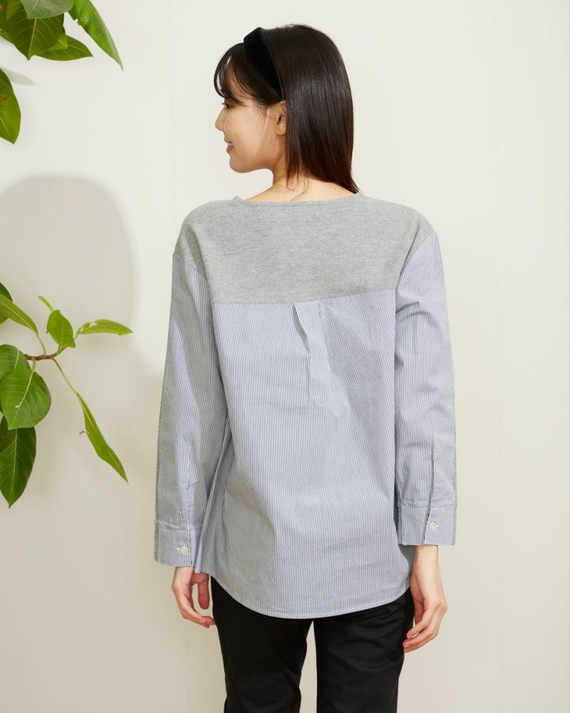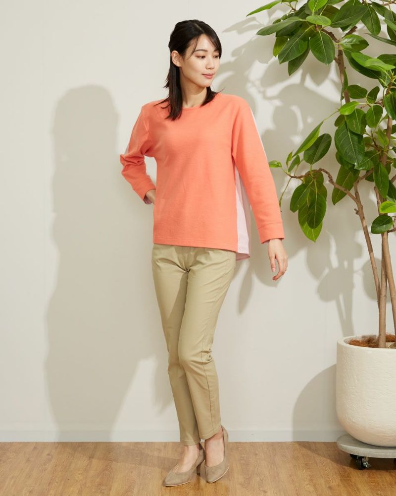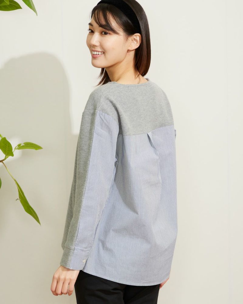 暖かな起毛のスムースにシャツ地を切り替えたデザイントップス。手触りの良い素材でコンパクトに作ったのでコートインもしやすいアイテムです。ベーシックなカラー展開です。 モデル身長: 167 cm 着用サイズ: M サイズ Golden Bear Ladies' カットソー (Ladies') 【着用アイテム】467Q2731 テーパードパンツ