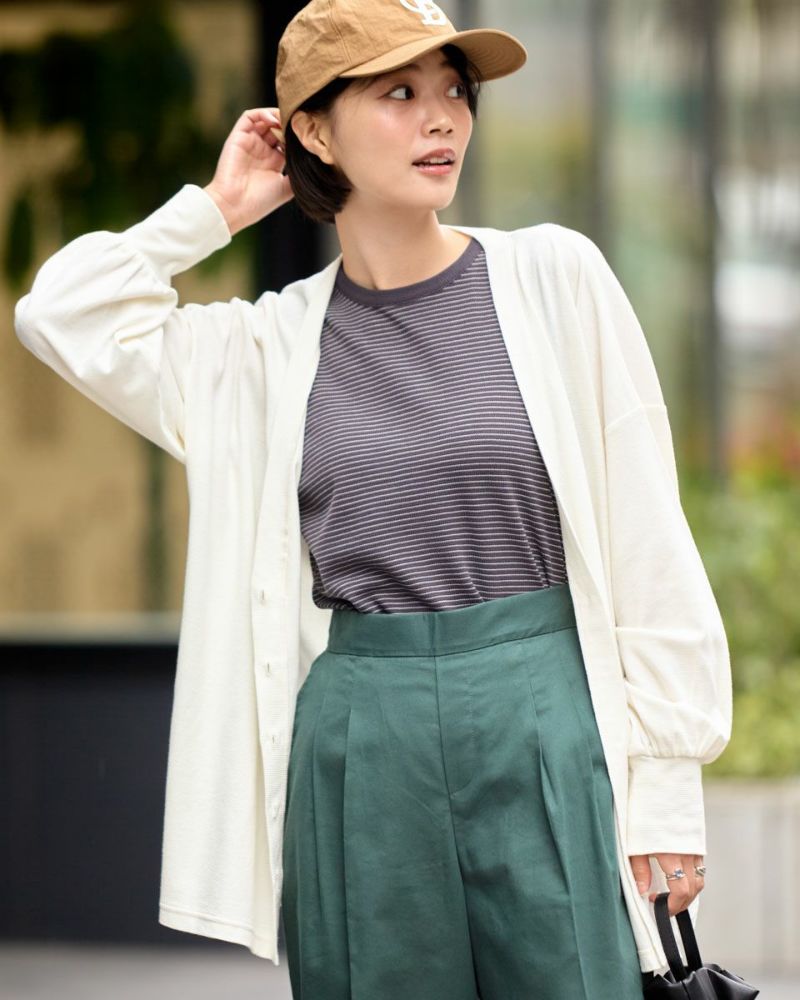 ソフトなタッチのホカケフライスを使用したカットソーのカーディガン。 お手入れが簡単で冷房対策や日除け、汗をかく時期にもお勧めです。コーディネートを邪魔しないオフ白と黒のベーシックな2色展開です。 モデル身長: 167 cm 着用サイズ: M サイズ Golden Bear WOMEN カットソー (WOMEN) 【着用アイテム】467Q4412 ボーダータンクトップ 467Q4712 コードレーンテーパードパンツ 468Q3751 ワイドパンツ