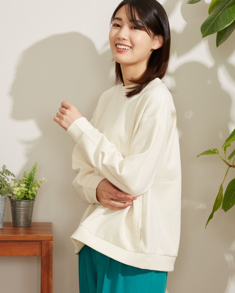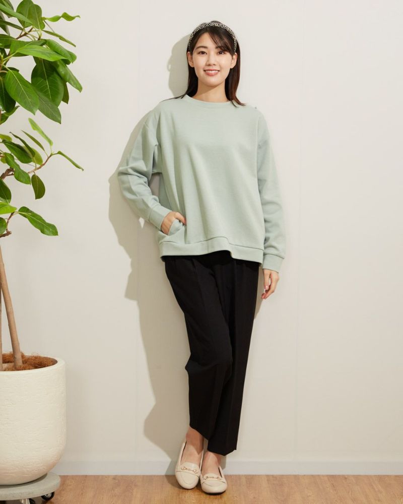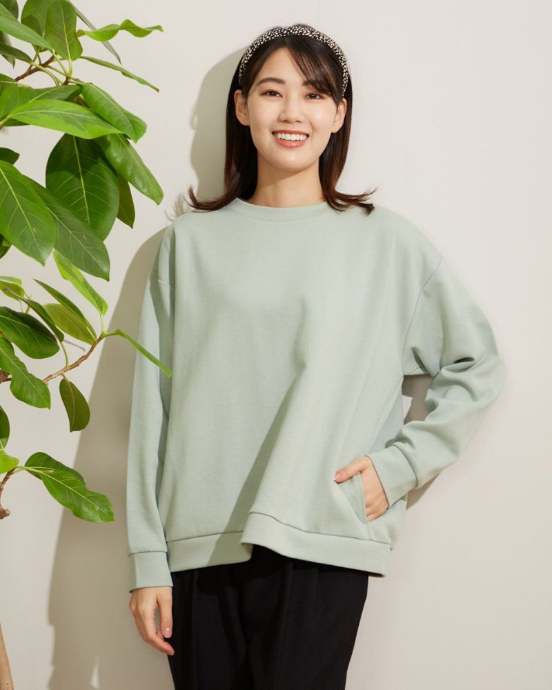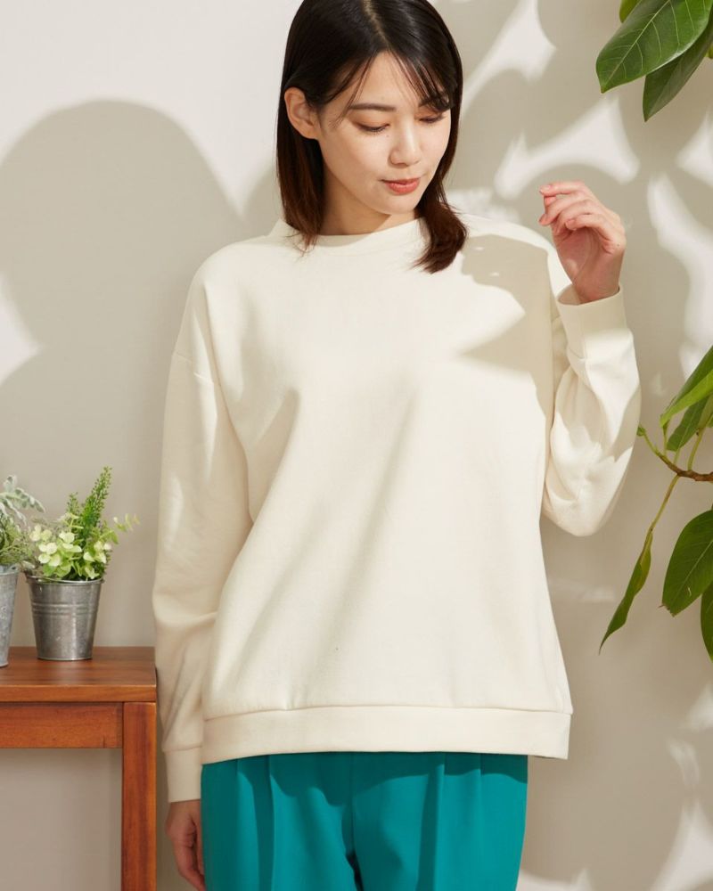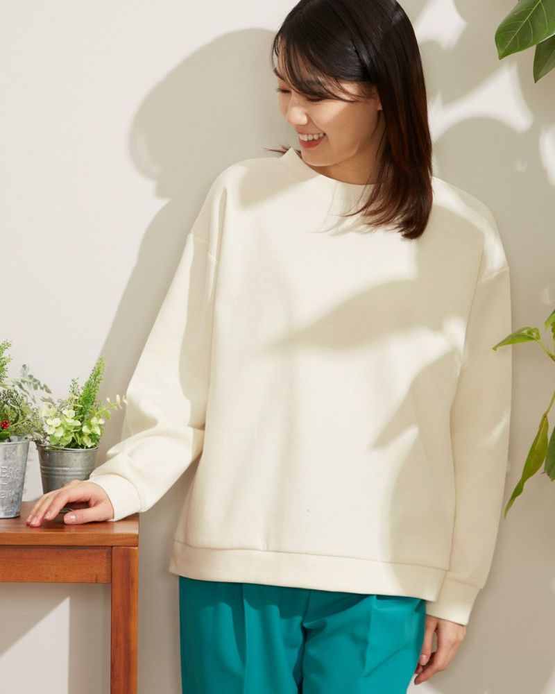 薄手のダンボール素材を使っています。裏毛に比べ張りがあり、ほのかな光沢が上品で、キレイ見えするスウェットです。ラフな印象にならないように、リブ使いを止め袖口や裾は共地で切り替えています。腰骨ほどの着丈と膨らみのある袖が女性らしく、ボトムスを選ばない点も魅力です。フロントはシンプルな仕様になっているので、ネックレスなどのジュエリーを添えてオフィスや学校行事での着用もおすすめです。寒さの強い日は468Q1450のカットソータートルをインナーに用いても可愛いです。毛羽のないクリーンで整った生地感で4月頃までデイリーにお召しいただけます。
