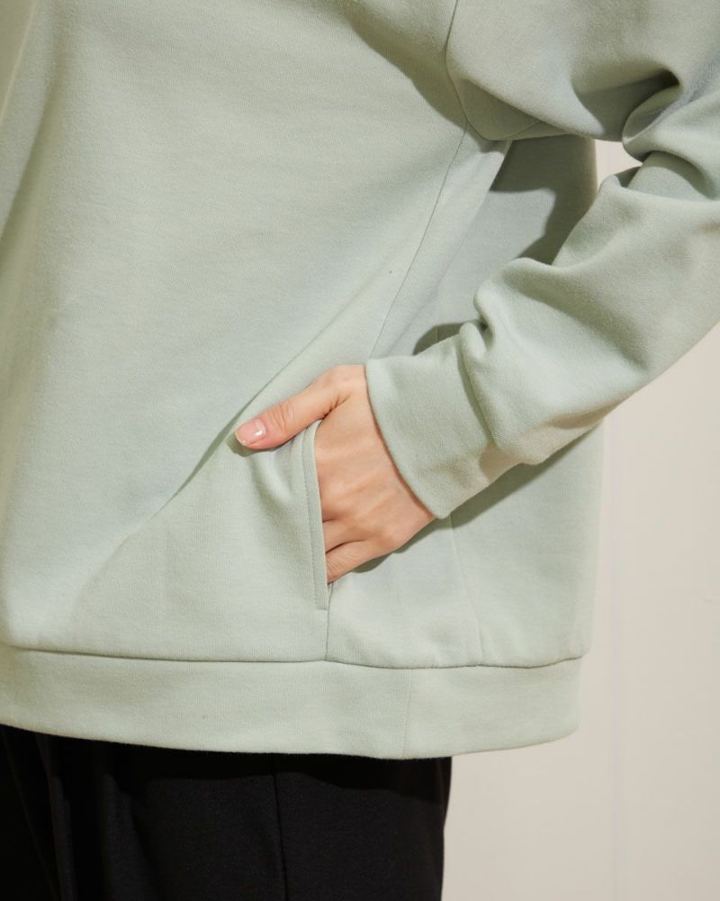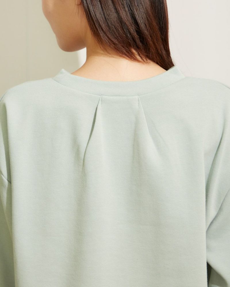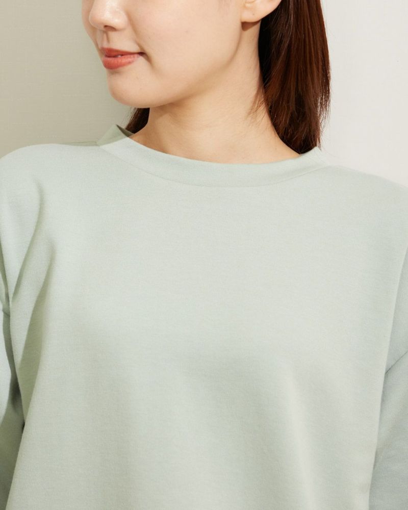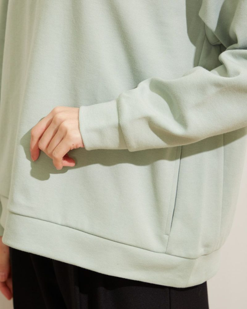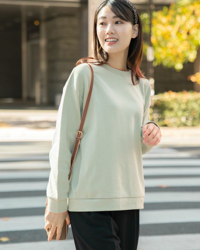 薄手のダンボール素材を使っています。裏毛に比べ張りがあり、ほのかな光沢が上品で、キレイ見えするスウェットです。ラフな印象にならないように、リブ使いを止め袖口や裾は共地で切り替えています。腰骨ほどの着丈と膨らみのある袖が女性らしく、ボトムスを選ばない点も魅力です。フロントはシンプルな仕様になっているので、ネックレスなどのジュエリーを添えてオフィスや学校行事での着用もおすすめです。寒さの強い日は468Q1450のカットソータートルをインナーに用いても可愛いです。毛羽のないクリーンで整った生地感で4月頃までデイリーにお召しいただけます。