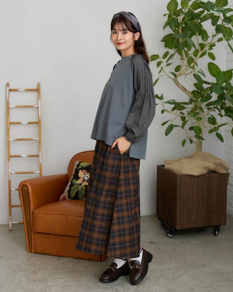 表裏ともに整った編地のスムースを身頃に使ったデザインカットソーです。優しい肌触りと適度な厚みで夏物とは違った落ち着き感と保温性があり、気温の下がってくる時期におすすめのアイテム。袖にはほのかな光沢のあるローンをセレクト。ダレ感がないため袖山に施したピンタックの凹凸感も消えることがなく華やかさが魅力の1着。身頃、袖共にゆとりがあるのでシアーインナーを合わせたりファーベストをレイヤードするのもおすすめ。黒とチャコールのモード感溢れるカラー展開は洒落感も抜群。地金のジュエリーとも相性が良くオフィス使いも◎リップとデニムを添え女子会でお召しになっても素敵です。