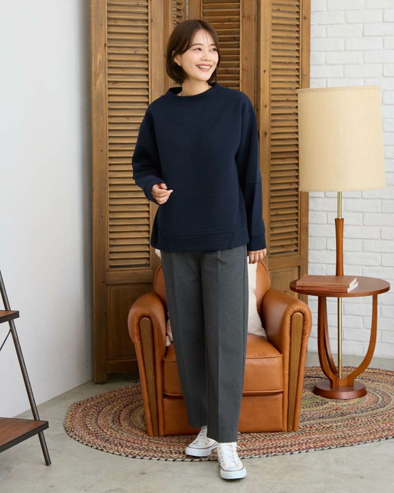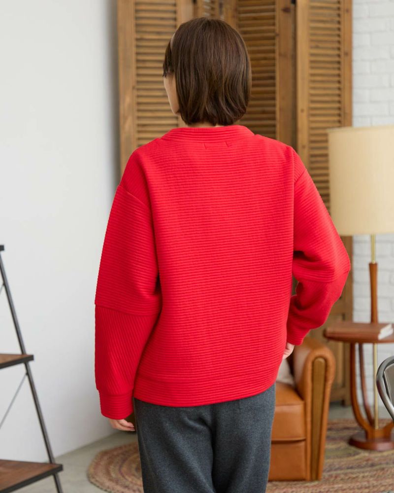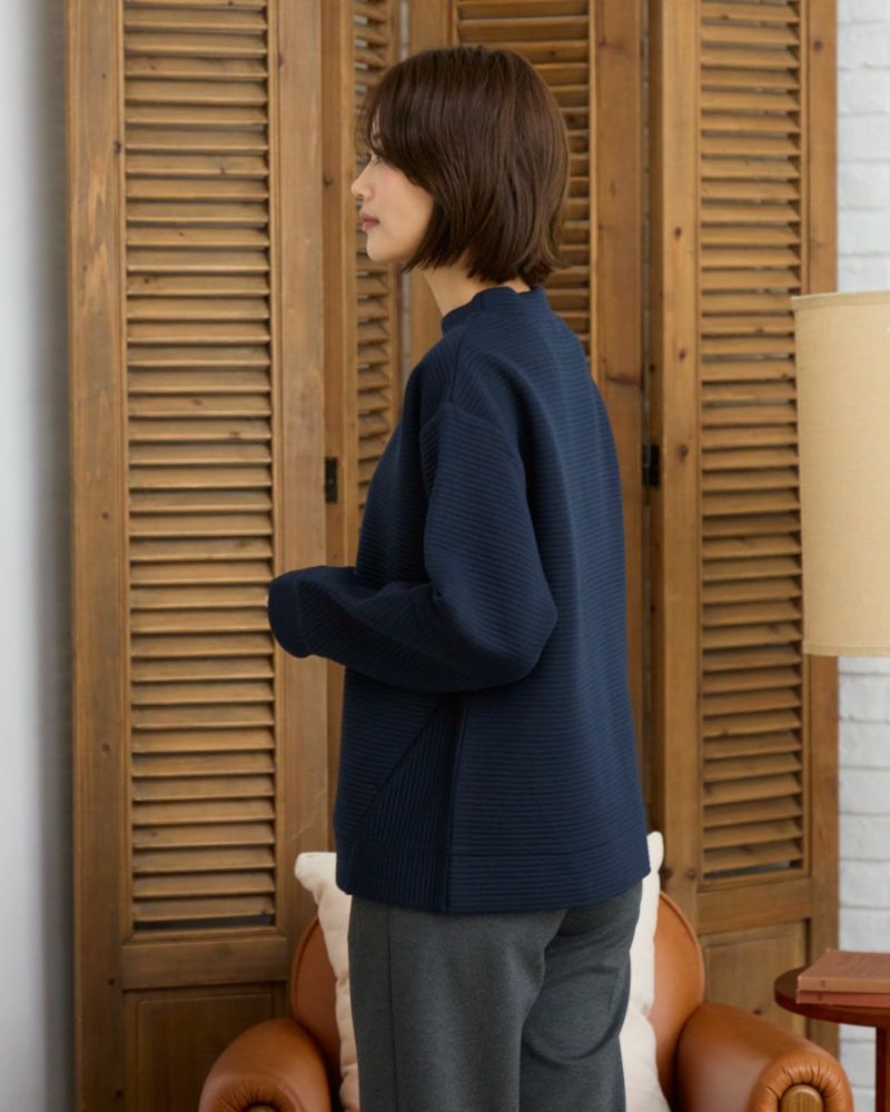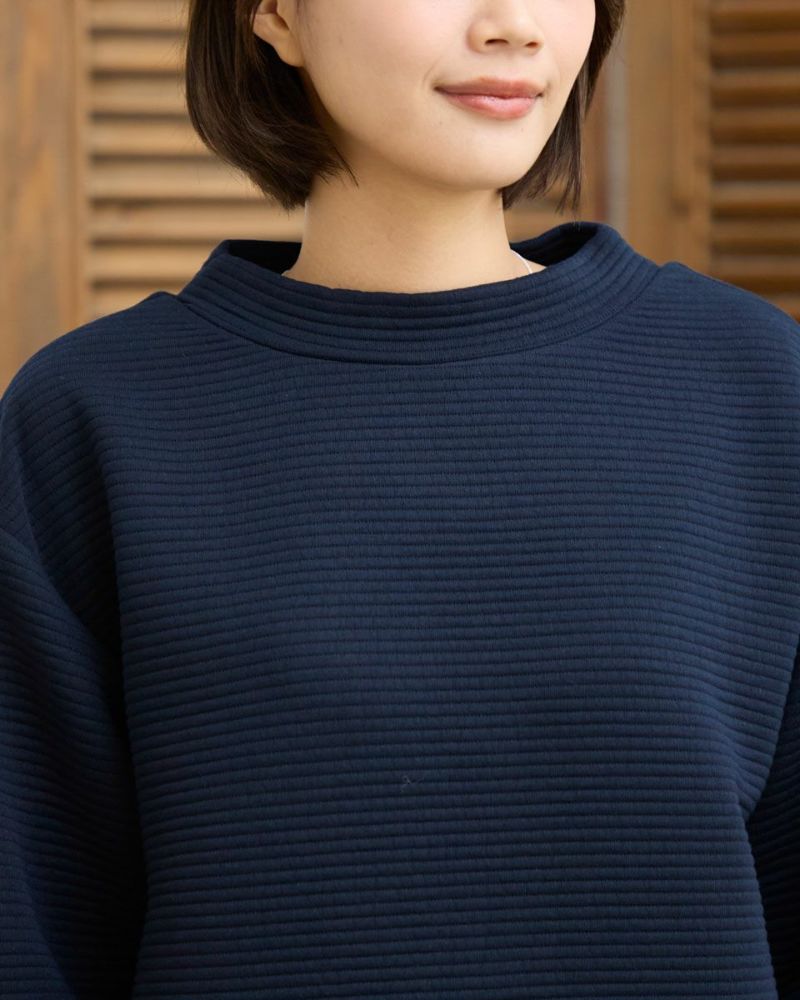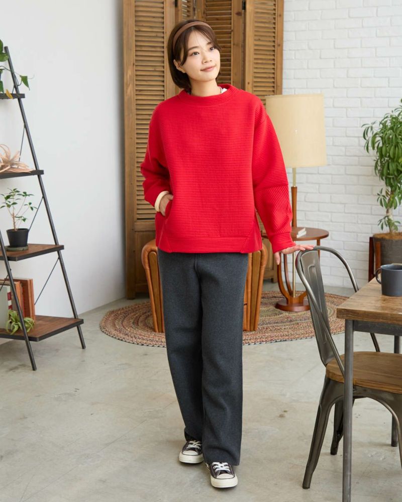 ぷくッと膨らんだ7㎜ほどのラインが並ぶ様子が可愛いカットソーキルトを使ったプルオーバー。ハイネックの襟で首元も暖かく、ラインを活かしタテや斜めに切り替えたディティールもシンプルなボディにリズムが生まれチャーミングな1着です。適度に厚みもあり空気を溜め込む構造で、重いスウェットやチクチクニットが苦手なお客様にもおすすめ。生地自体に表情があるので、ネイビーでも真面目になり過ぎない洒落感が魅力。華やかなレッドはチノやデニムなどボーイズライクなボトムスと中和させる着こなしがおすすめ。アイキャッチになるので推し活使いも楽しいですね。 モデル身長: 167 cm 着用サイズ: M サイズ Golden Bear White Label (Ladies') カットソー (Ladies') 【着用アイテム】468RD751 ポンチストレートパンツ 468RD760 ダブルフェイスニットパンツ