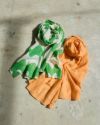 オレンジは、薄く細かく織ったコットンを使っています。サラッと軽やかでベタつかず、家庭洗濯ができるため、寒さ対策だけでなく、ちょっと気温が高い日の日差し除けにもおすすめ。180cmx60cmのサイズ感はしっかり首元を覆い肩や膝を包んでくれます。ぱっと見、無地っぽく見えるプリントは水田に舞う蛍の群れをイメージ。あぜ道の先に広がる幻想的な景色をビビットな点描で表現しました。