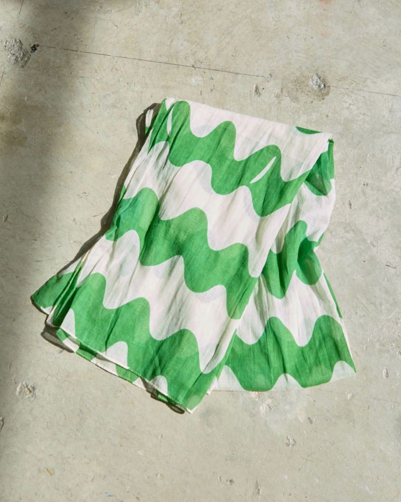 アイボリーは、パッと目を引くグリーンの配色が華やか。180㎝と長さも有り、さまざまな巻き方を楽しんでいただけます。くねくねと蛇行する波線はWHITE LABELのWをイメージしたもの。ご自宅での手洗い可能です。