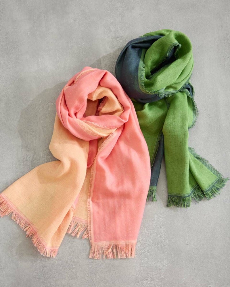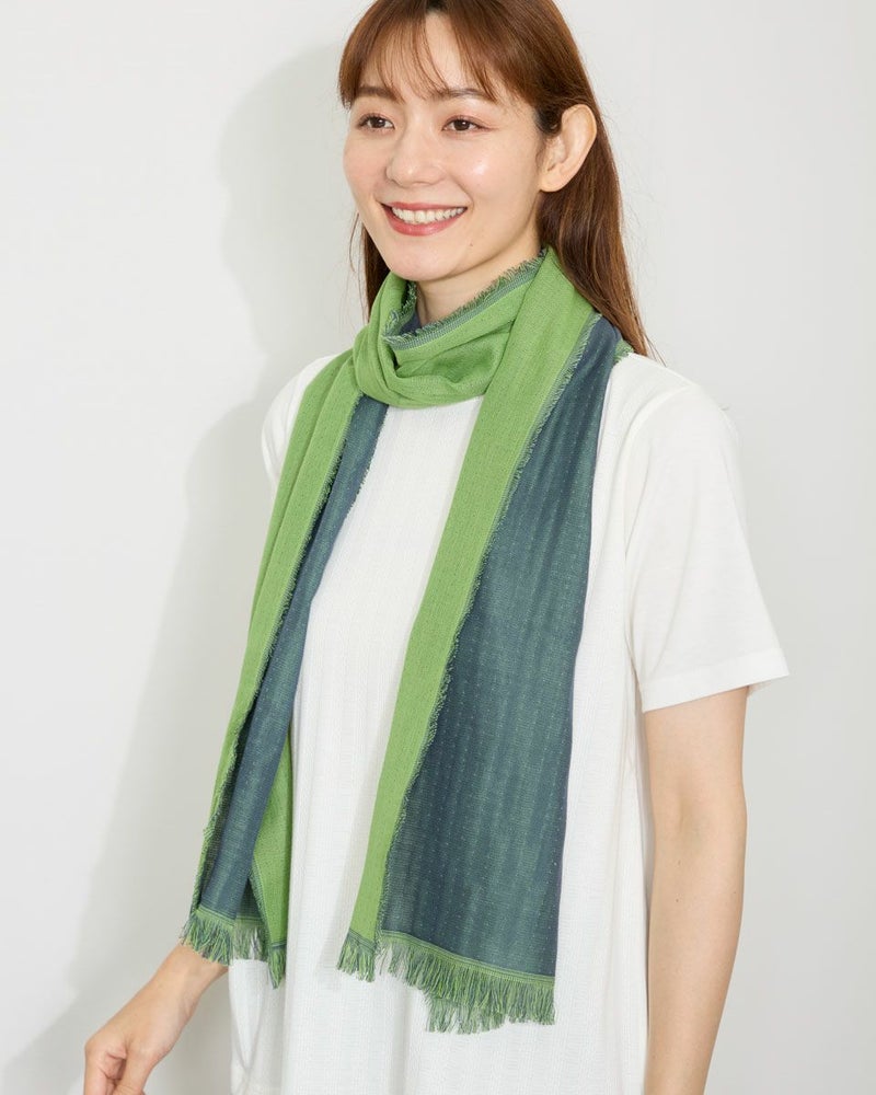 表と裏で異なるカラーのストールです。 巻き方次第で変化を楽しめます。夏の冷房対策やコーディネイトのアクセントに使えます。 Golden Bear WOMEN アクセサリ (WOMEN) 【着用アイテム】467QA410 ジャカード切替Tシャツ