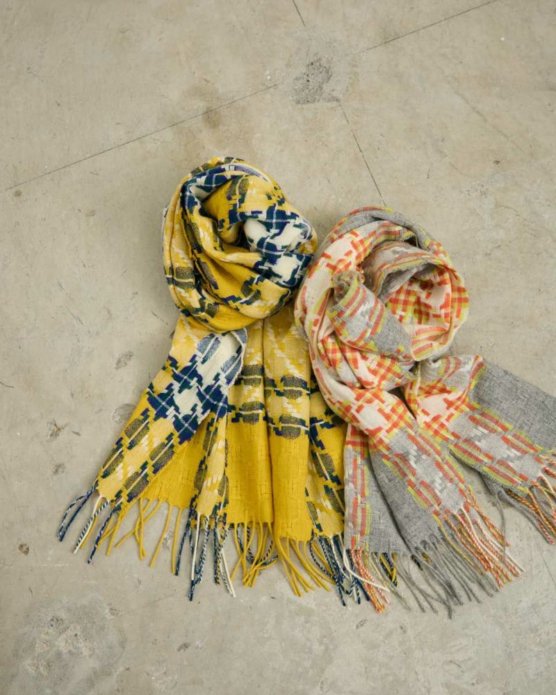 薄手で柔らかなWOOLを使用したチェックストールです。ジャカード織が表情を豊かにコーディネートのアクセントになります。 Golden Bear Ladies' アクセサリ (Ladies') 【着用アイテム】467QD431 ロゴプルオーバー 468QD650 クルーネックPO 467QE702 ストレートパンツ 468QD750 ストレートパンツ