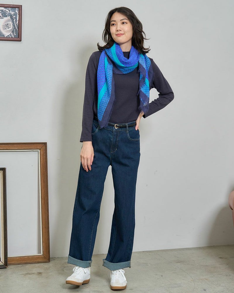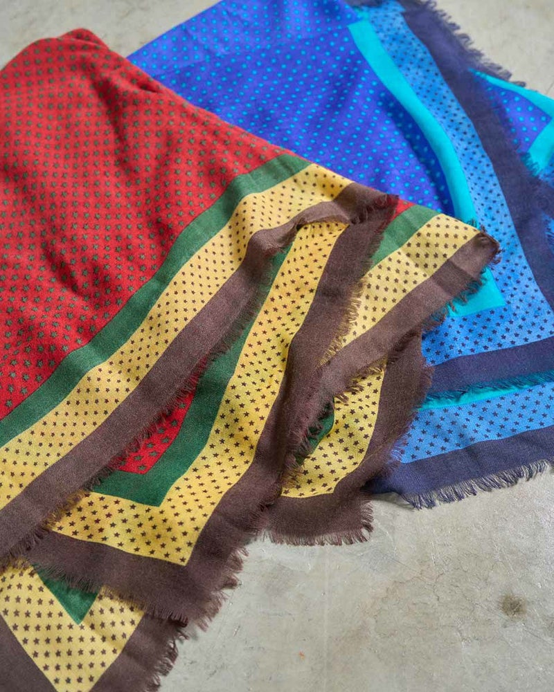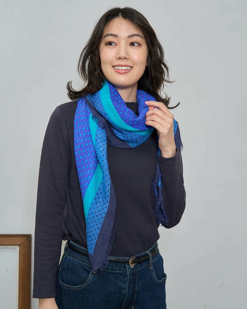 暖かなウール素材を使用した正方形の大判ストールです。細かな星柄がポップになり過ぎず巻くだけで主役になるストールです。 Golden Bear WOMEN アクセサリ (WOMEN) 【着用アイテム】467RD402 布帛切替カットソー 467RD403 リブハイネックカットソー 468RD750 コーデュロイスカート