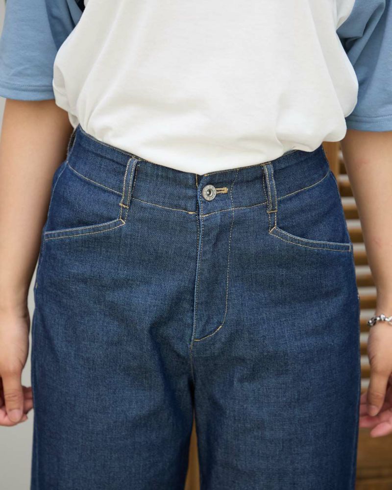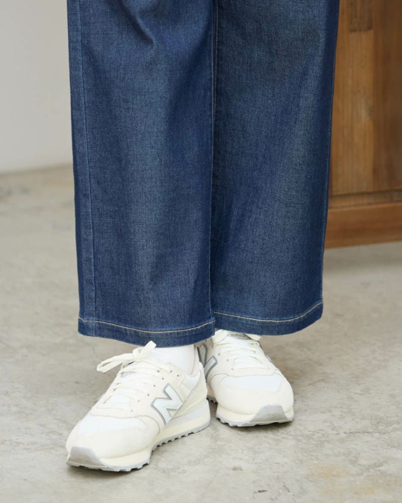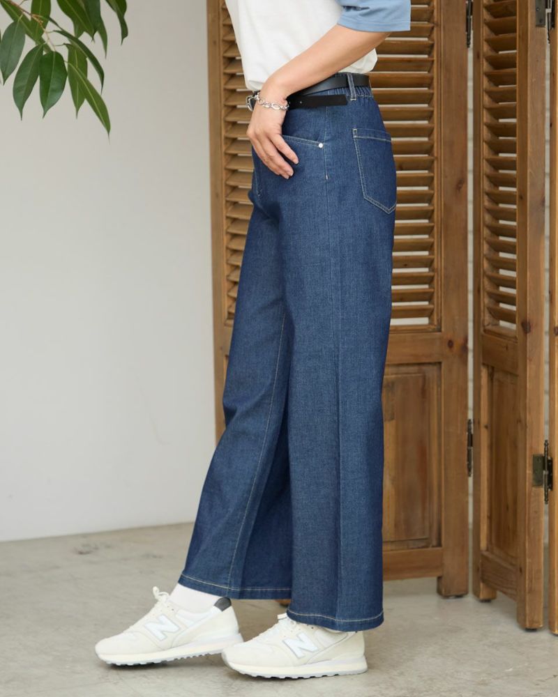 キャラメルの表面の様に見える変わり織りデニムを使用したパンツです。薄手のライトオンスデニムです。色はインディゴの濃淡の2色展開です。デザインは後ろウエストにギャザーゴムを入れ全体にゆったりした分量のワイドシルエットです。 モデル身長: 168 cm 着用サイズ: 61 サイズ Golden Bear QUEEN SIZE(Ladies' 大きいサイズ ) ボトムス (Ladies') 同デザイン通常サイズはこちら