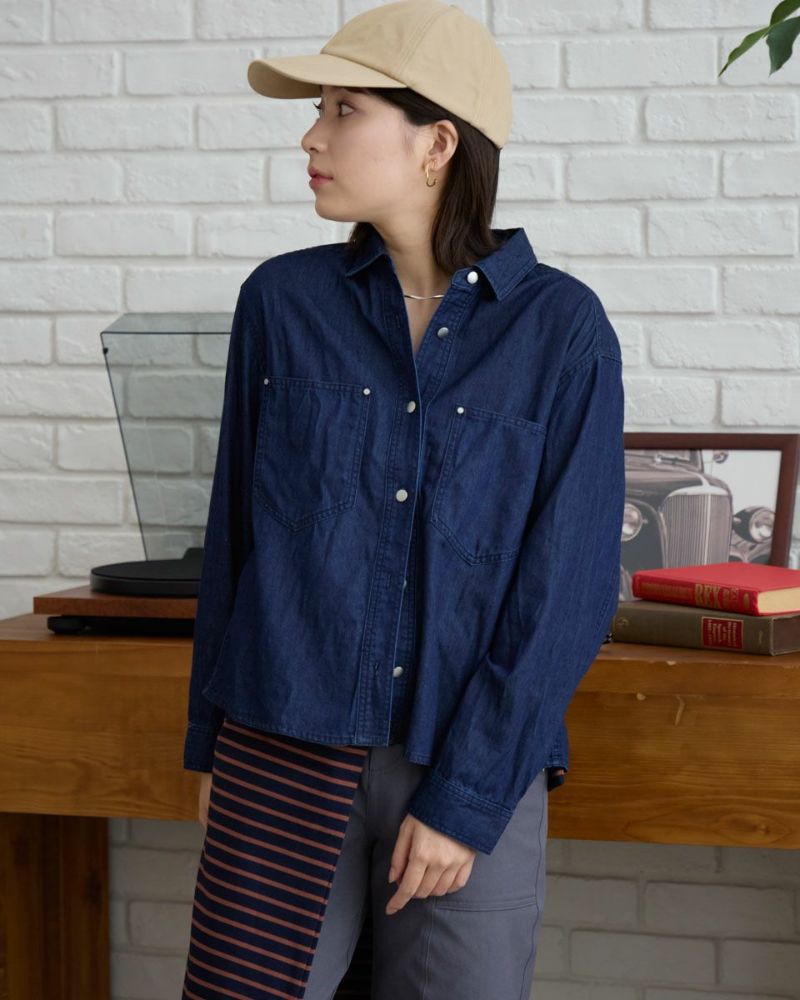 ショート丈のデニムシャツです。柔らかい素材でちょっとした羽織としても使いやすいアイテムです。カジュアルすぎないメタル釦がポイントです。ボリュームのあるボトムスと合わせるスタイリングがおすすめです。 モデル身長: 162 cm 着用サイズ: M サイズ Golden Bear QUEEN SIZE(Ladies' 大きいサイズ ) ブラウス (Ladies') 同デザイン通常サイズはこちら