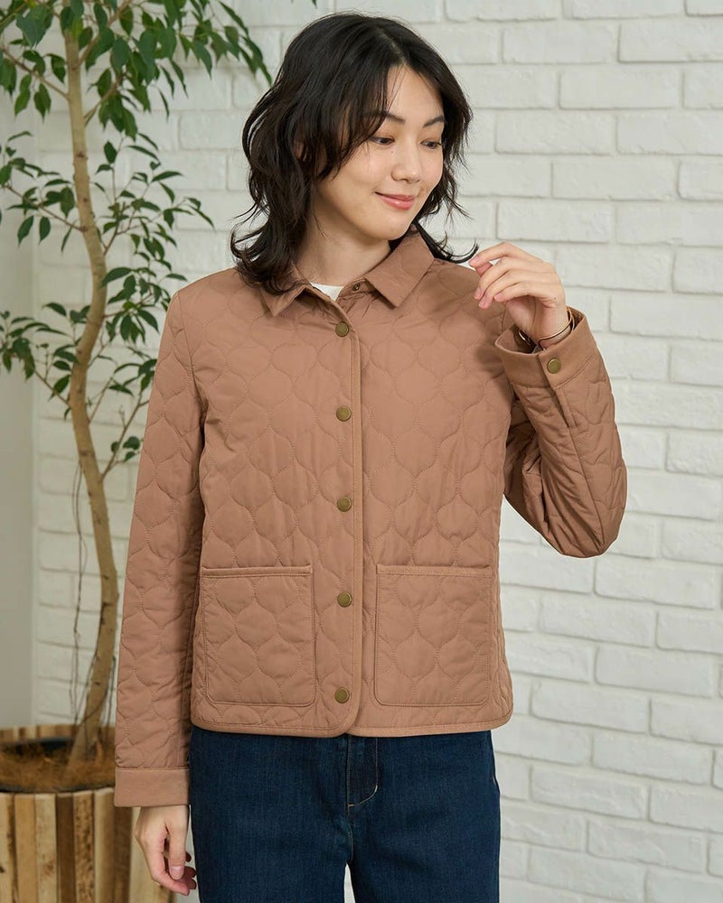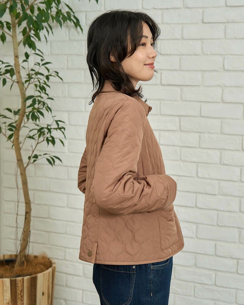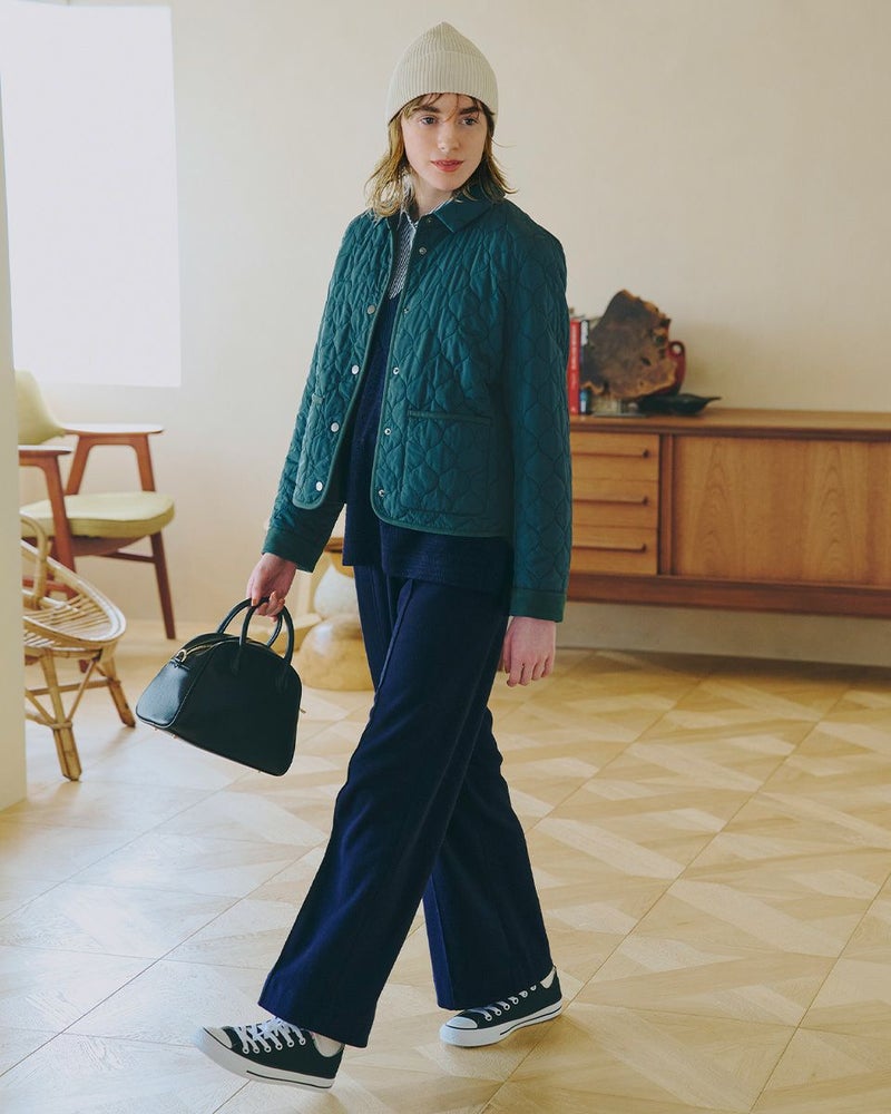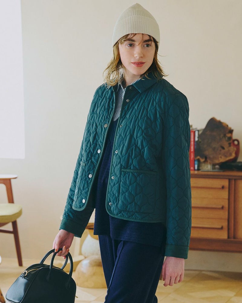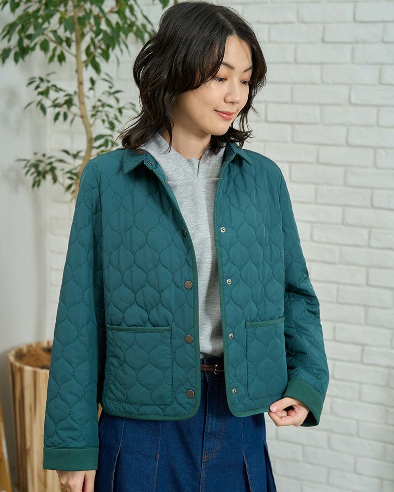 撥水加工したポリエステルタフタを使用したショート丈のキルトジャケットです。薄い中綿を小さいヒョウタン柄にキルトし軽く仕上げました。袖口、台襟、パイピングは同色に染めた別布を使用しています。前中心はドット釦開きで、後ろにドット釦付きベンツが有ります。色はモカとグリーンの2色です。 モデル身長: 166 cm 着用サイズ: M サイズ Golden Bear WOMEN アウター (WOMEN) 【着用アイテム】467RC403 脇ボタンカットソーベスト 468RD453 ワンポイント刺しゅうパーカ 467RE303 ストライプシャツ 467RD710 セミワイドニットパンツ 468RC751 デニムスカート