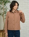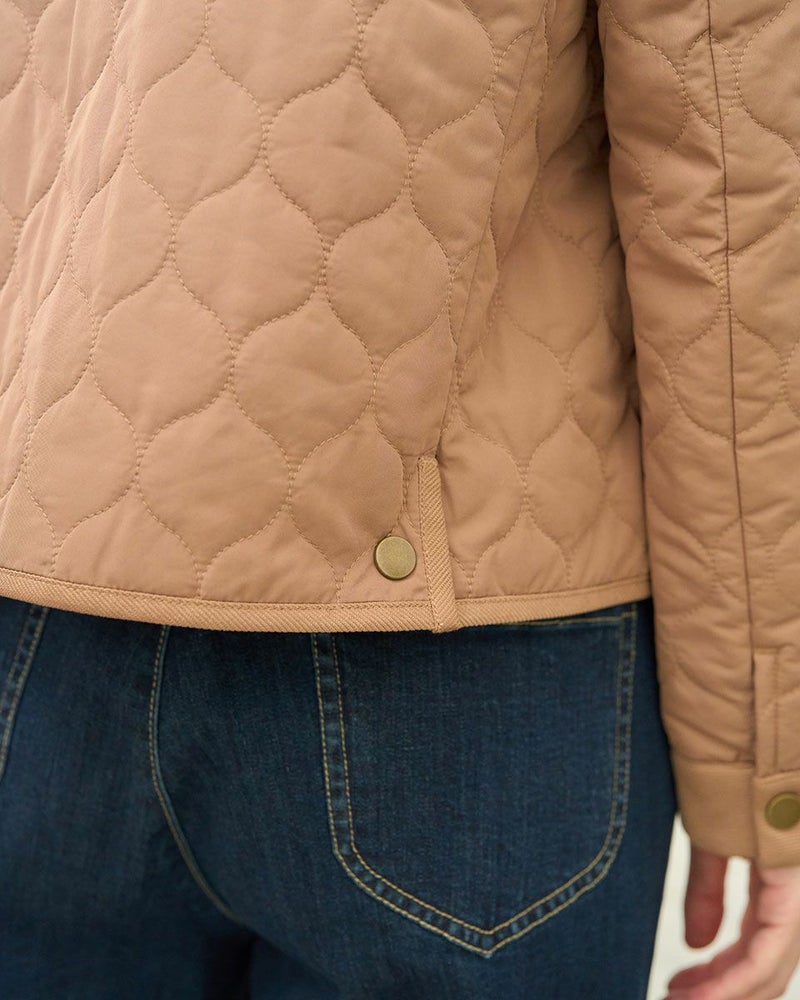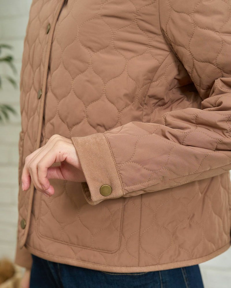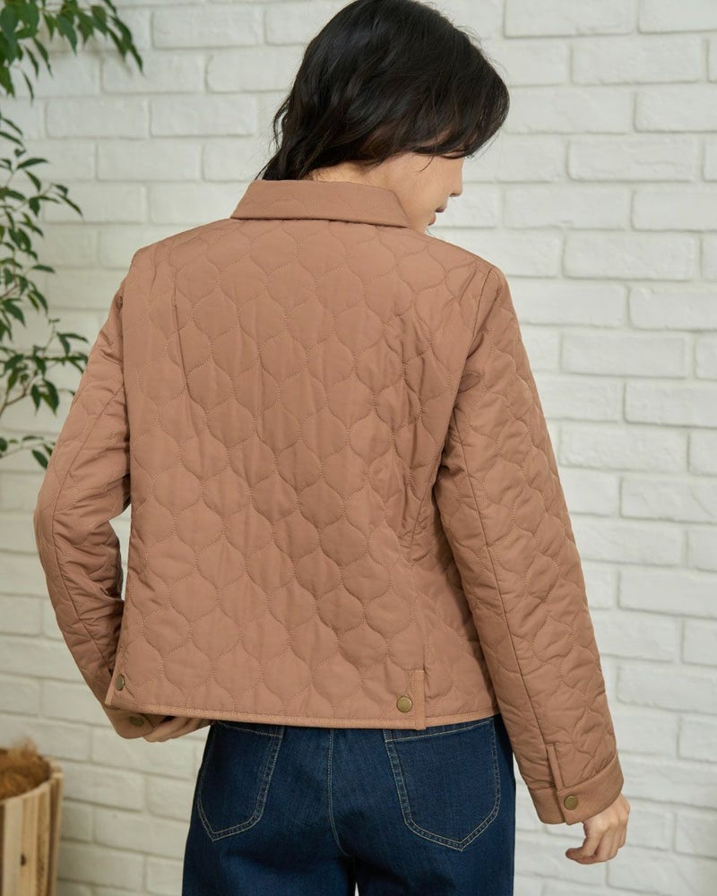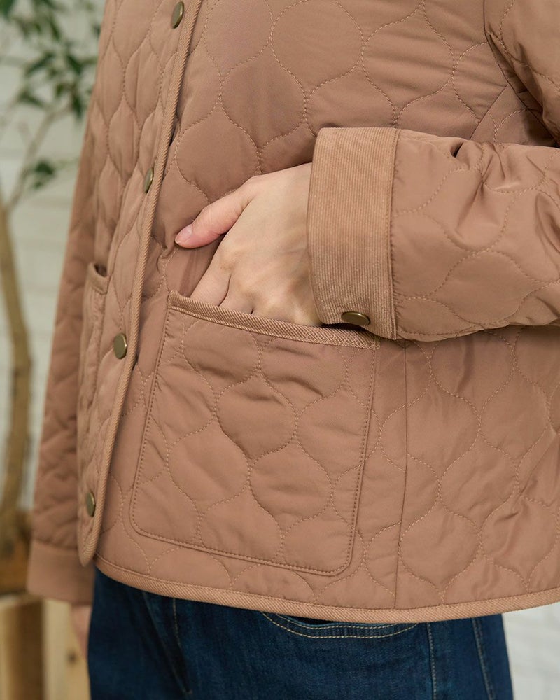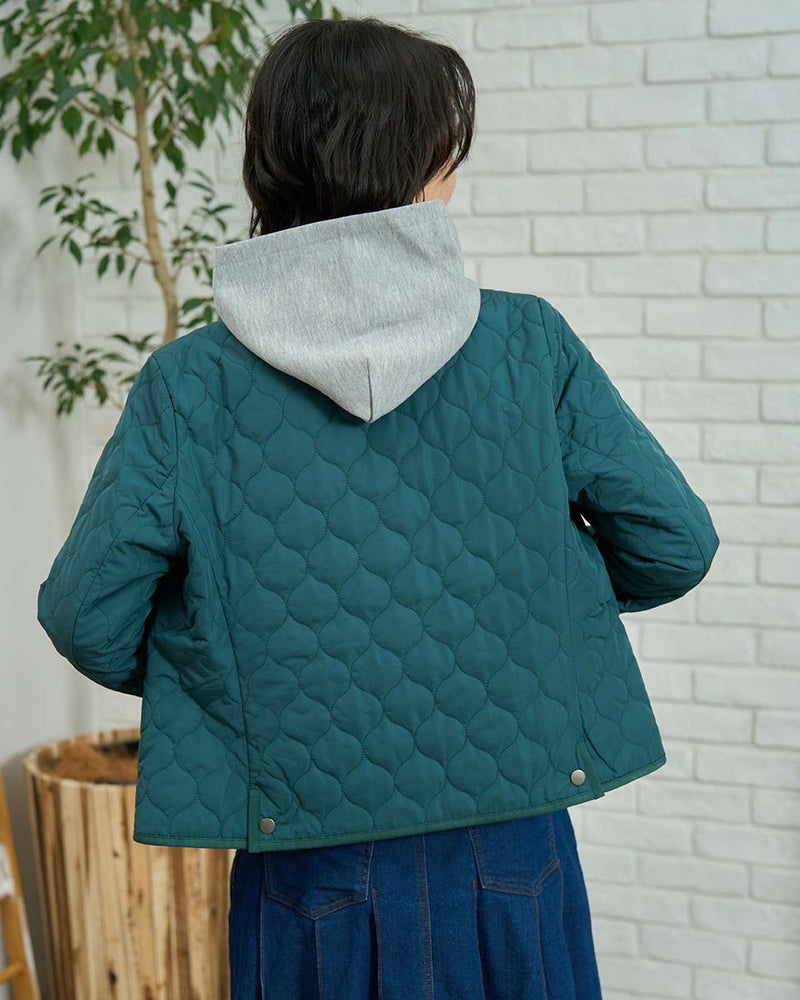 撥水加工したポリエステルタフタを使用したショート丈のキルトジャケットです。薄い中綿を小さいヒョウタン柄にキルトし軽く仕上げました。袖口、台襟、パイピングは同色に染めた別布を使用しています。前中心はドット釦開きで、後ろにドット釦付きベンツが有ります。色はモカとグリーンの2色です。 モデル身長: 166 cm 着用サイズ: M サイズ Golden Bear WOMEN アウター (WOMEN) 【着用アイテム】467RC403 脇ボタンカットソーベスト 468RD453 ワンポイント刺しゅうパーカ 467RE303 ストライプシャツ 467RD710 セミワイドニットパンツ 468RC751 デニムスカート
