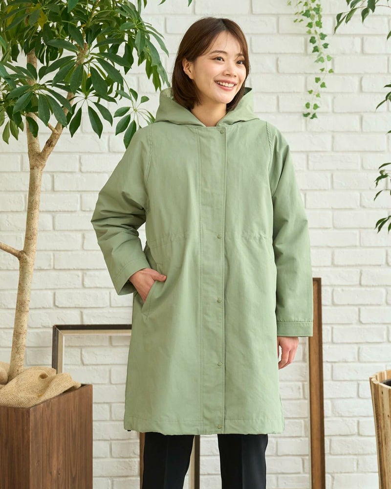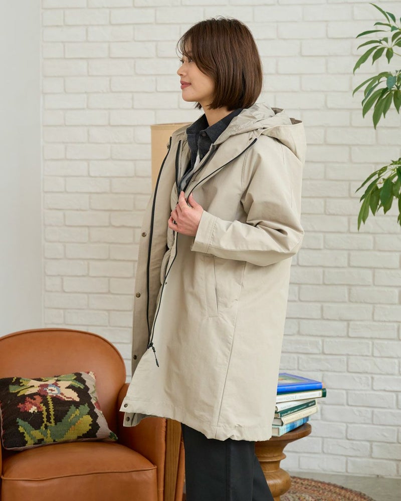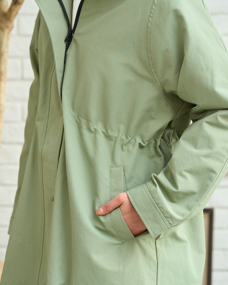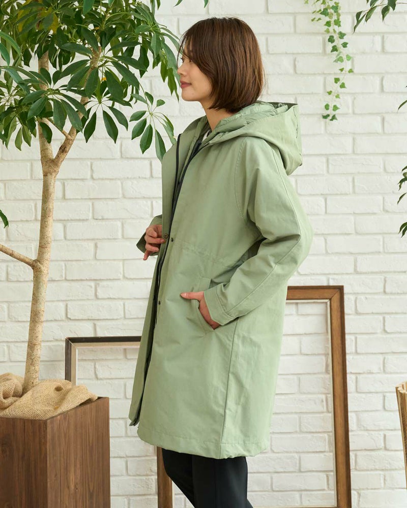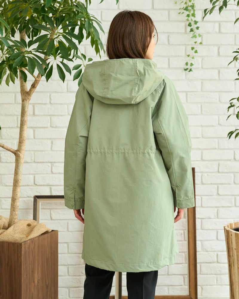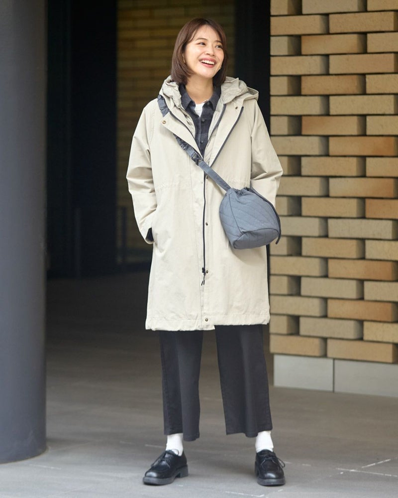 マットな表情の70デニールタフタを使用したダウンライナー付きのコートです。表はラグランスリーブで袖ぐり、身幅の分量をゆったりとりました。ウエスト部分と裾にゴム紐を通しているのでシルエットの調整ができます。ライナーは50gのグリーンダウンを入れ裾は前後差をつけヒップが隠れる長さにしています。表・ライナー共にフードが付いています。
