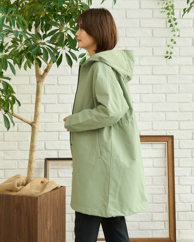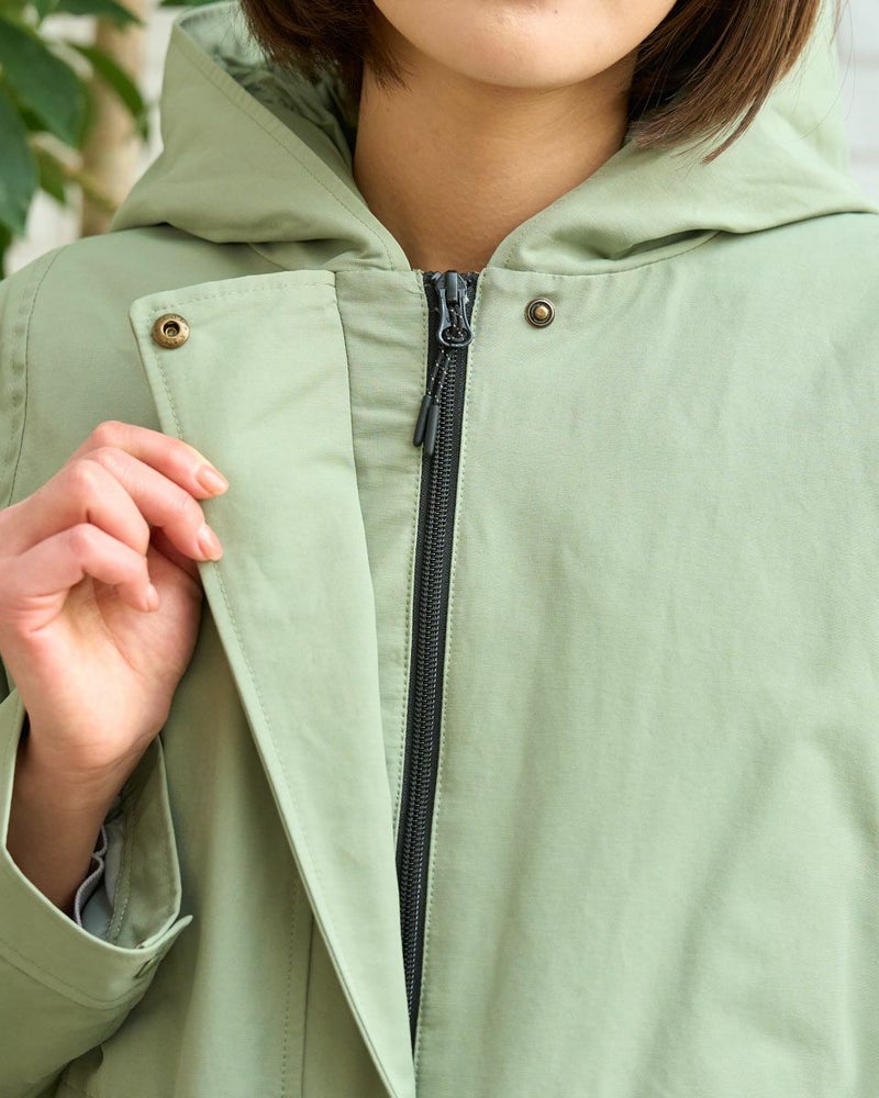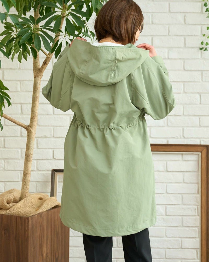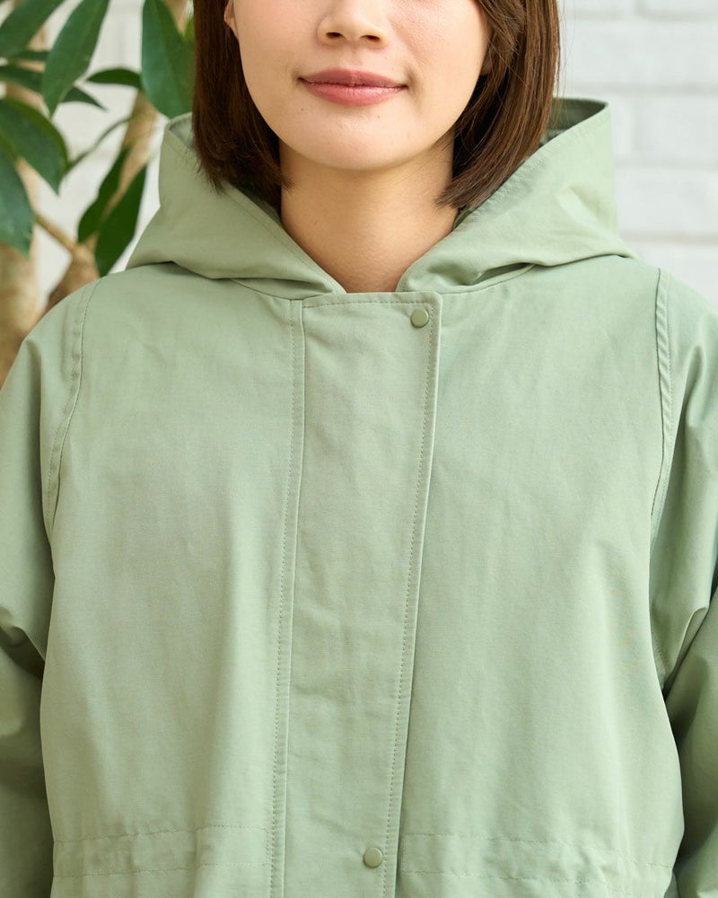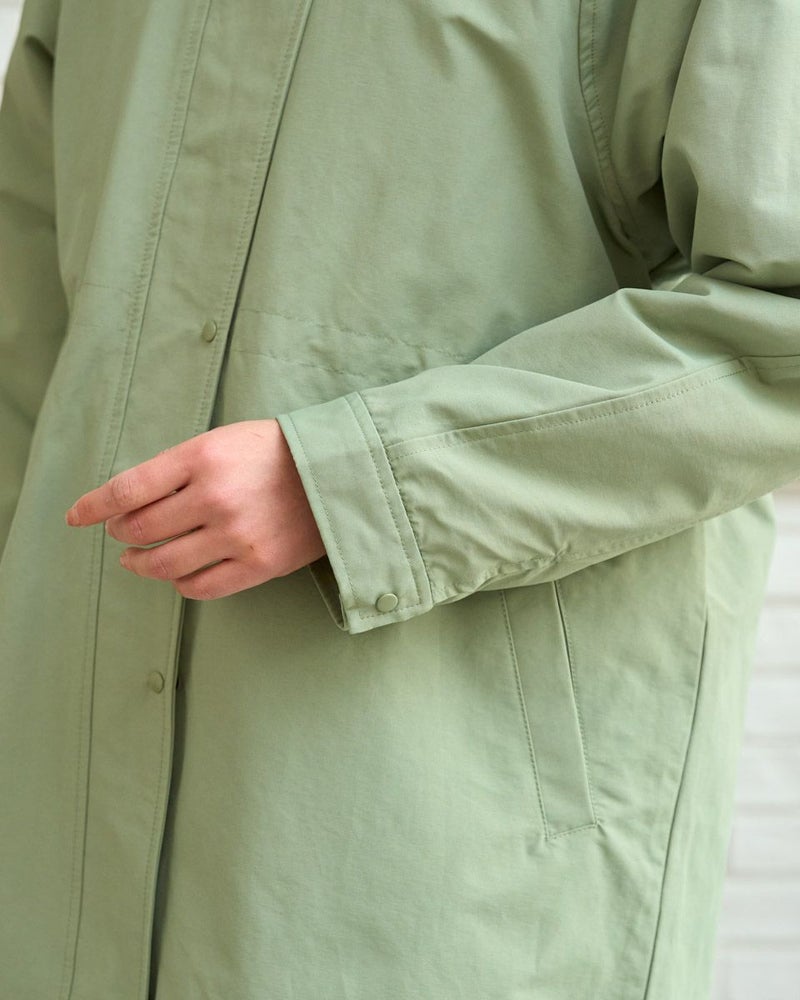 マットな表情の70デニールタフタを使用したダウンライナー付きのコートです。表はラグランスリーブで袖ぐり、身幅の分量をゆったりとりました。ウエスト部分と裾にゴム紐を通しているのでシルエットの調整ができます。ライナーは50gのグリーンダウンを入れ裾は前後差をつけヒップが隠れる長さにしています。表・ライナー共にフードが付いています。