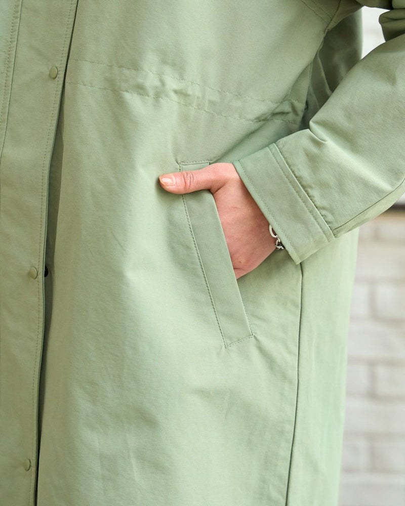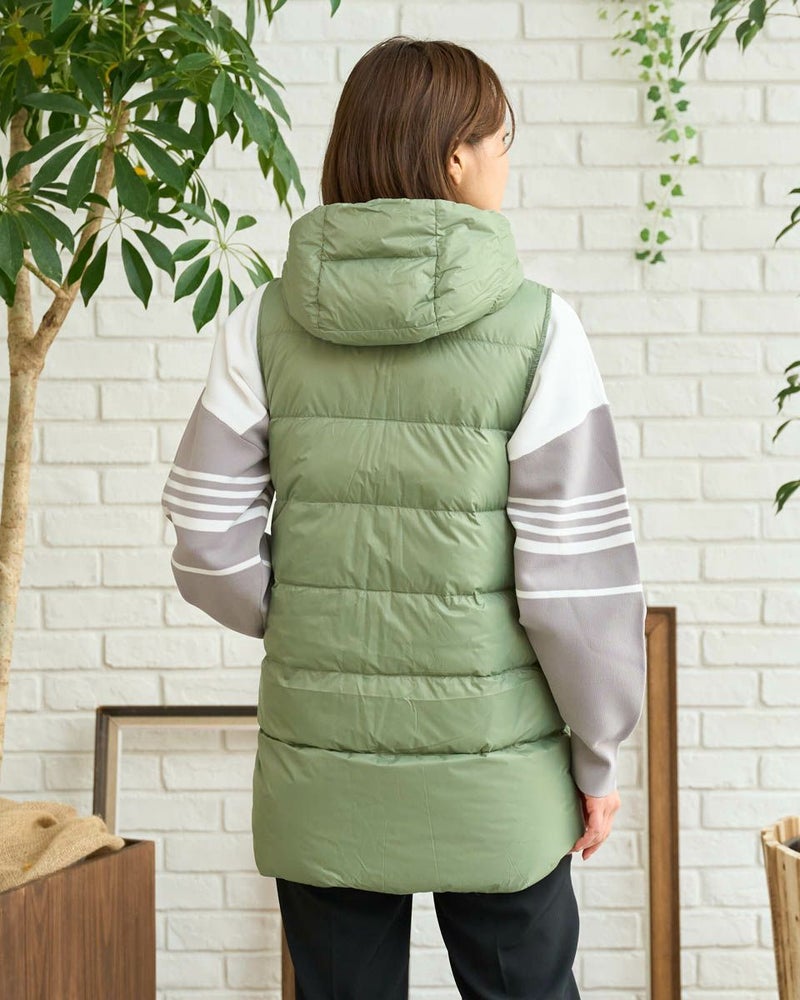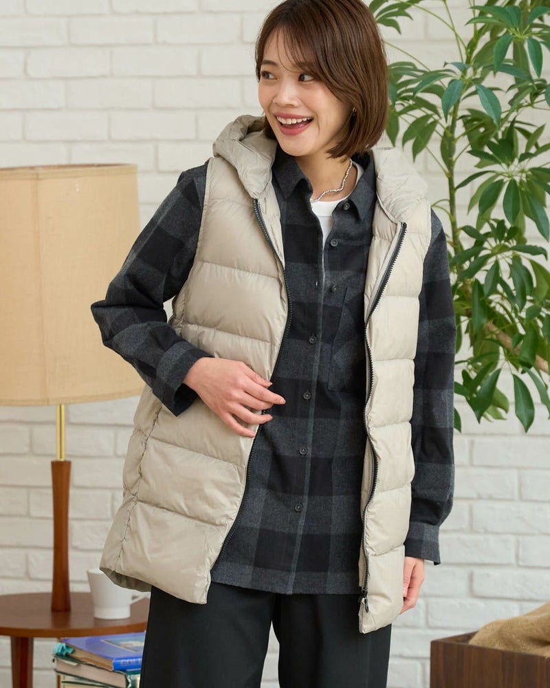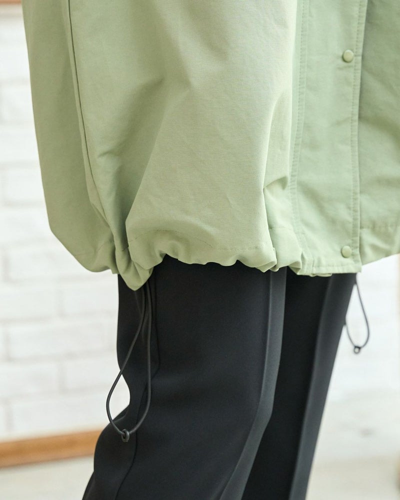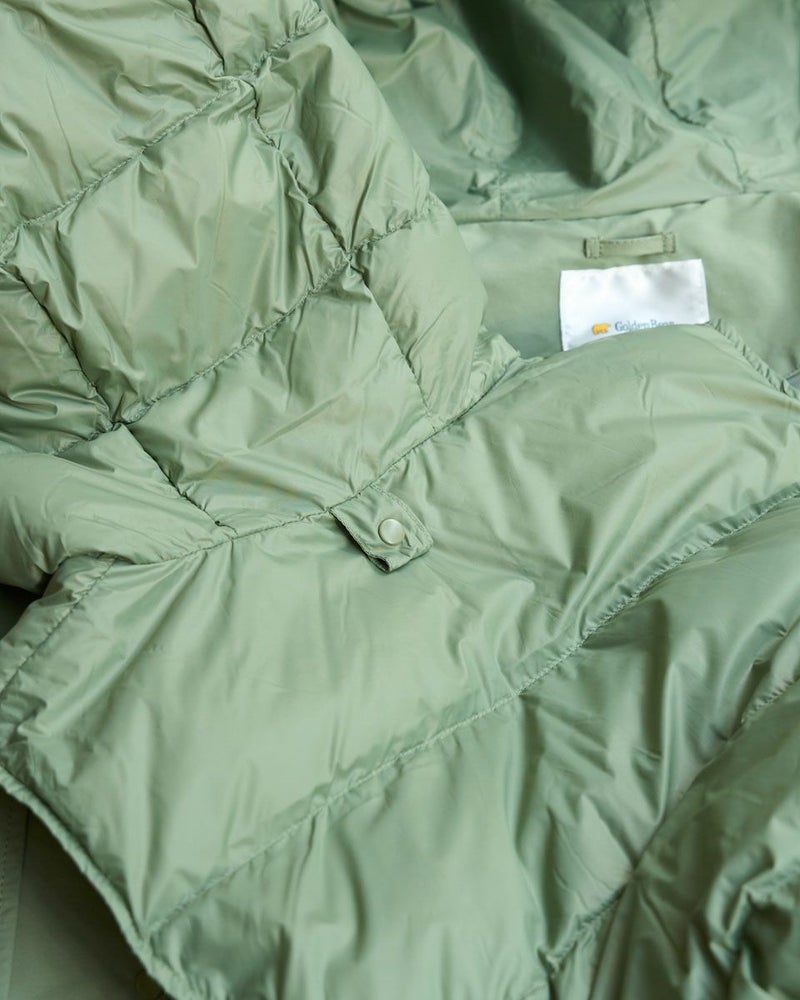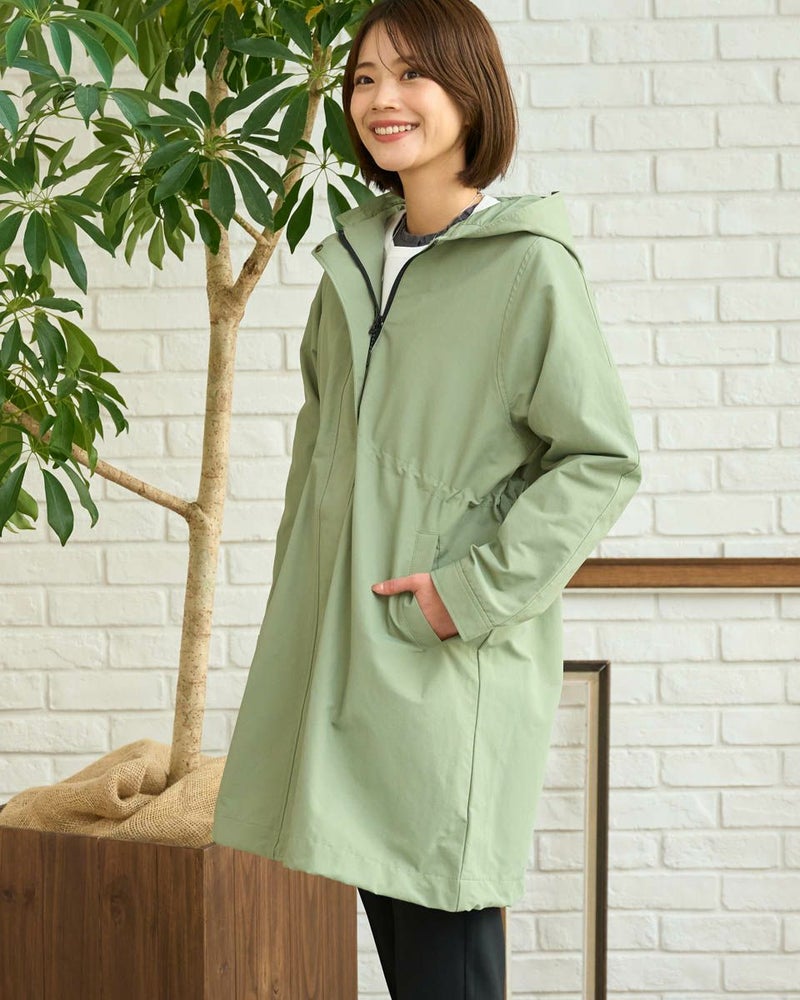 マットな表情の70デニールタフタを使用したダウンライナー付きのコートです。表はラグランスリーブで袖ぐり、身幅の分量をゆったりとりました。ウエスト部分と裾にゴム紐を通しているのでシルエットの調整ができます。ライナーは50gのグリーンダウンを入れ裾は前後差をつけヒップが隠れる長さにしています。表・ライナー共にフードが付いています。