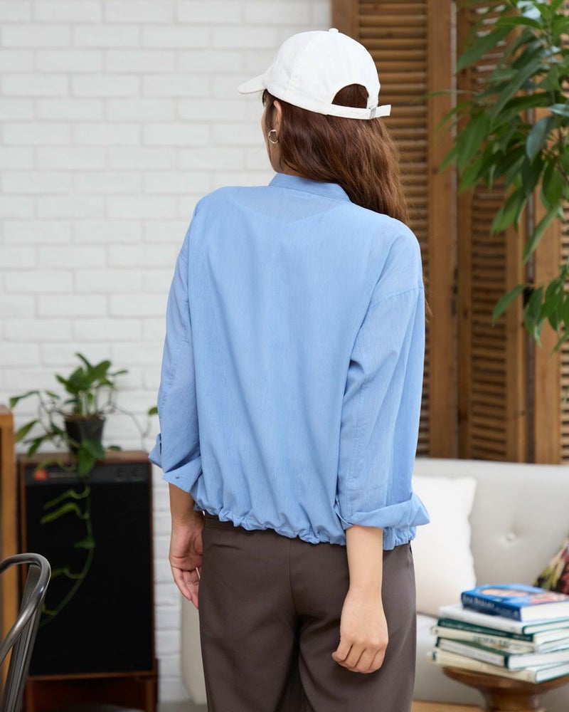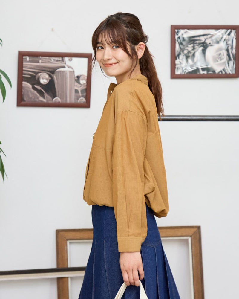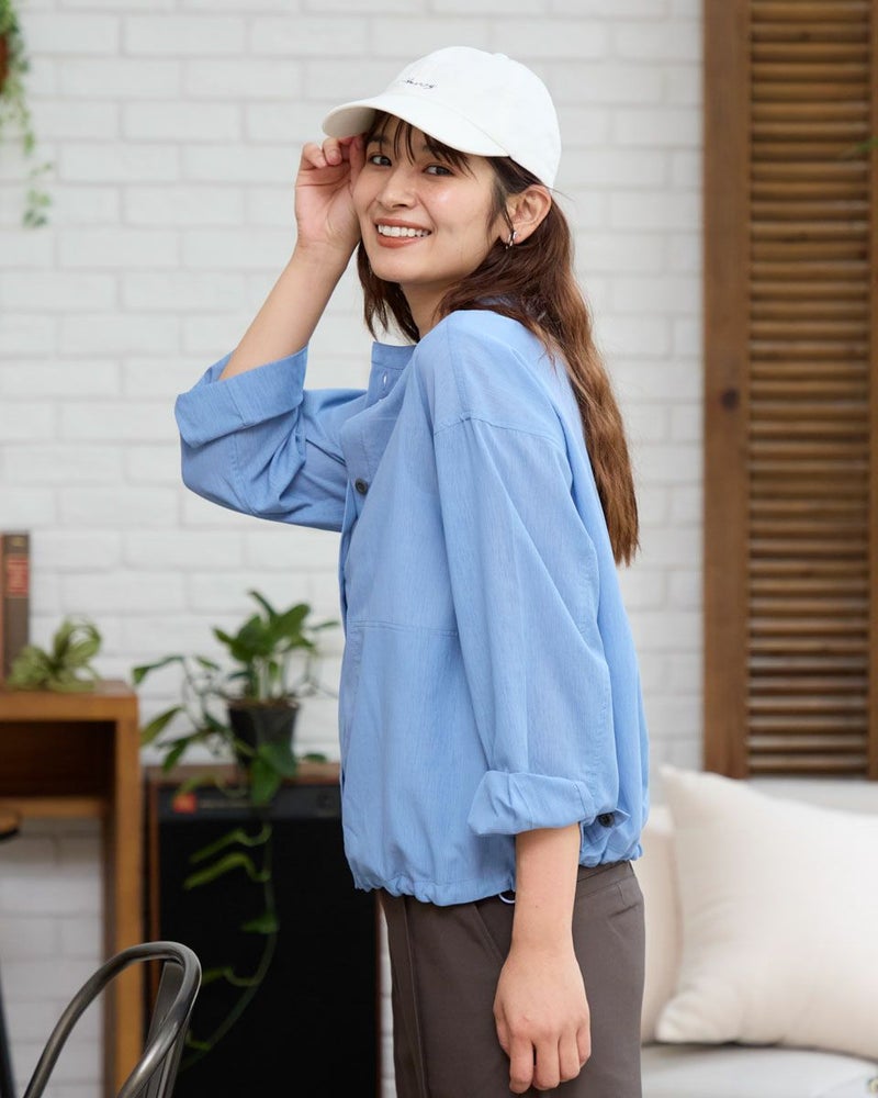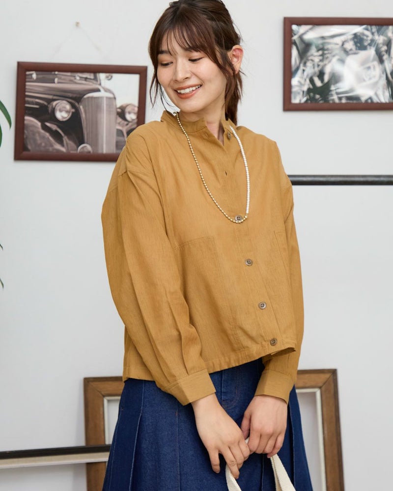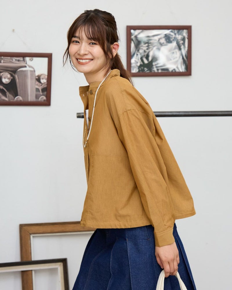 細かなシボやランダムな織りムラが生み出す陰影で生地の表面が揺らぐ様子も上品なオーガンジー調の生地をセレクト。軽く薄手で透け感もあり程よい張りコシでダレる事がないので清潔感のあるスタイリングに仕上がります。少し高さを付けたハイネックの襟は羽織った時のきちんと感も演出しオン・オフ両軸でお召しいただけます。腰骨に届くほどのショート丈はボトムスを選ばず今期はバレル型のパンツとのコーディネートもおすすめ。裾のドロストを絞って丸く立体感を出すと、こなれた雰囲気が出て素敵です。キャメルと彩度を抑えたブルーは色が落ち着いてくる初秋カラーとも馴染み高温が続く9月までお使いいただけます。