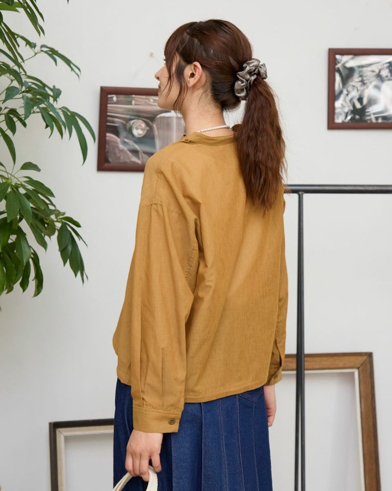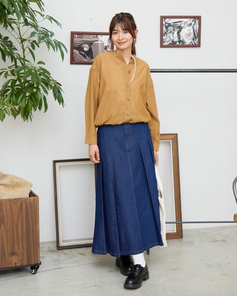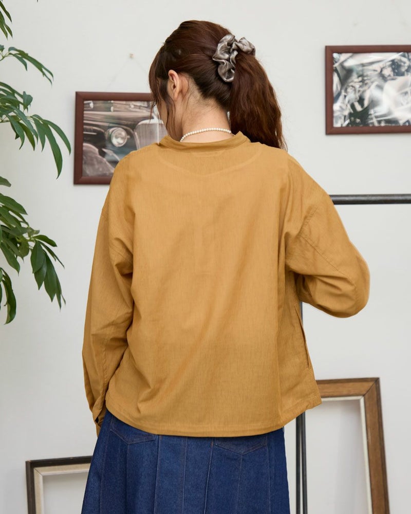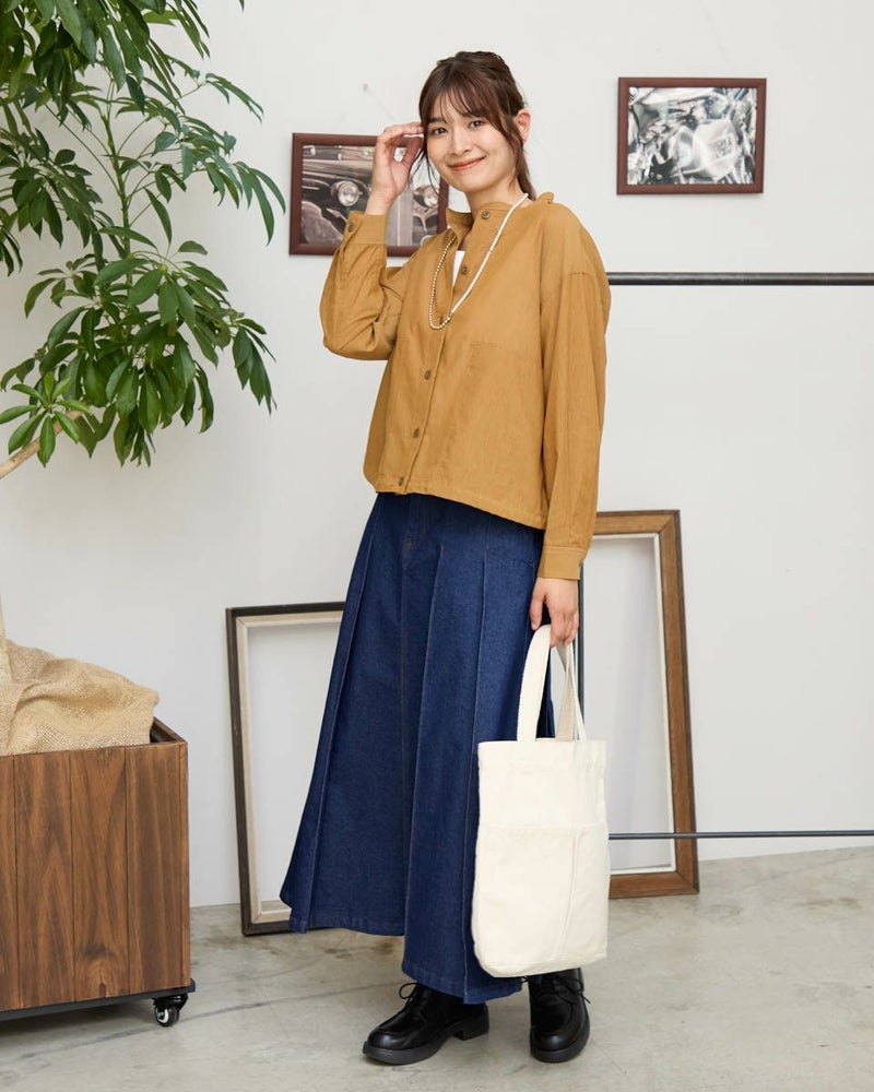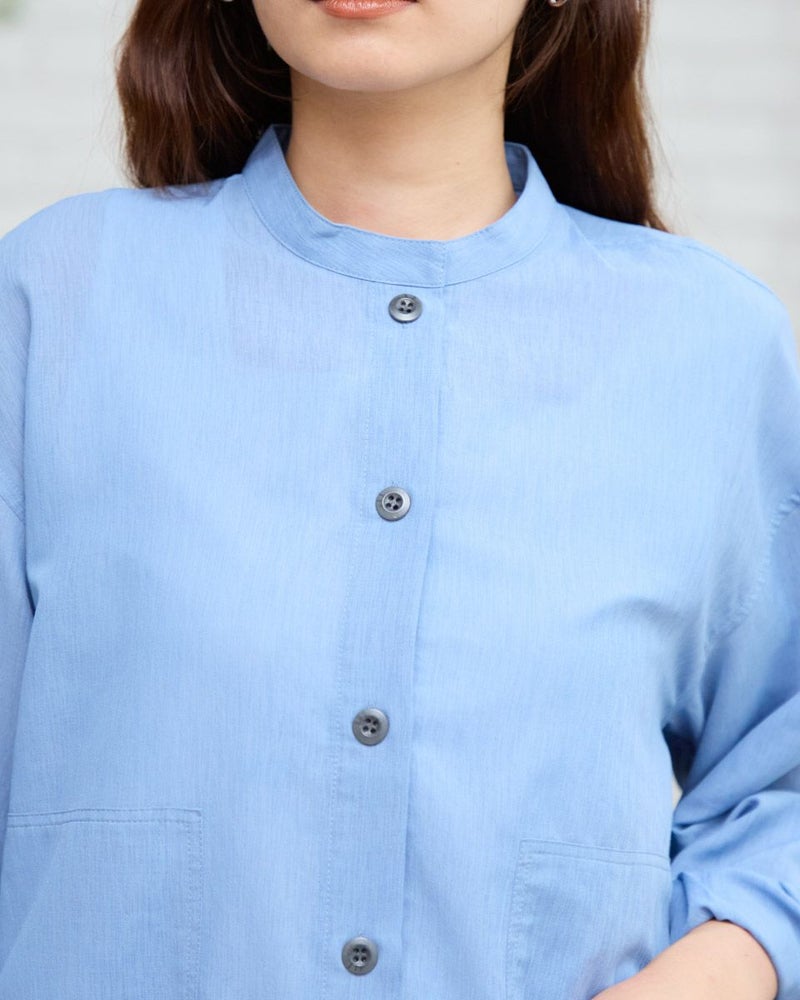 細かなシボやランダムな織りムラが生み出す陰影で生地の表面が揺らぐ様子も上品なオーガンジー調の生地をセレクト。軽く薄手で透け感もあり程よい張りコシでダレる事がないので清潔感のあるスタイリングに仕上がります。少し高さを付けたハイネックの襟は羽織った時のきちんと感も演出しオン・オフ両軸でお召しいただけます。腰骨に届くほどのショート丈はボトムスを選ばず今期はバレル型のパンツとのコーディネートもおすすめ。裾のドロストを絞って丸く立体感を出すと、こなれた雰囲気が出て素敵です。キャメルと彩度を抑えたブルーは色が落ち着いてくる初秋カラーとも馴染み高温が続く9月までお使いいただけます。