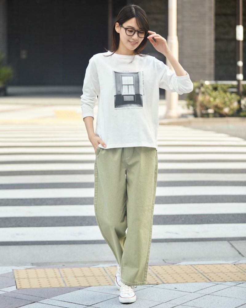 綿100%のツイルを使用したアンクル丈のストレートパンツです。ストレッチの入っていない素材ですので、30cmの深い股上で、ヒップから裾にかけて全体にゆったりとした分量をとっています。ウエストは開き無しのギャザーゴム仕様で内側に紐を通しています。 モデル身長: 166 cm 着用サイズ: S サイズ Golden Bear Ladies' ボトムス (Ladies') 【着用アイテム】467Q2403 プリントTシャツ