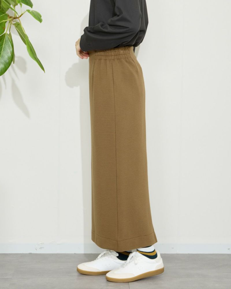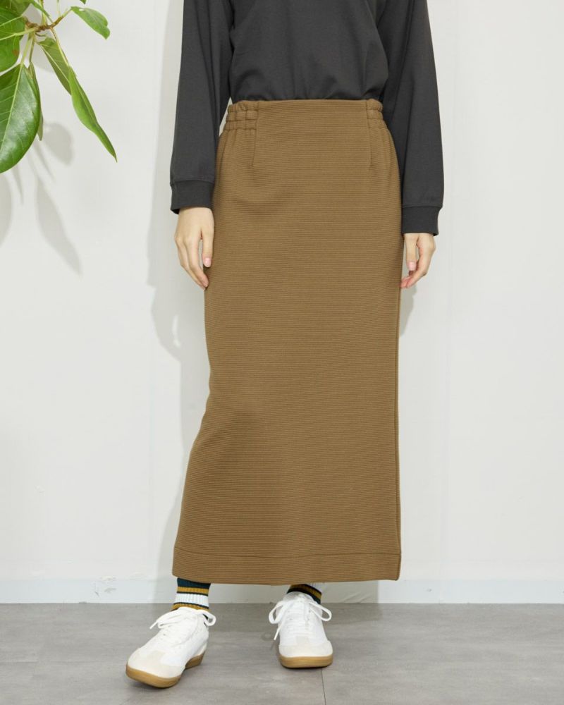 リップル素材のカットスカート。スッキリしたストレートシルエットのシンプルなデザインなのでさまざまなトップスとの相性が良いアイテムです。後ろ裾にベンツ開きあり。ウエストはファスナー開き、部分的にゴムを使用していて、正面はすっきりしているのでトップスインをしてもスマートに着用できます。