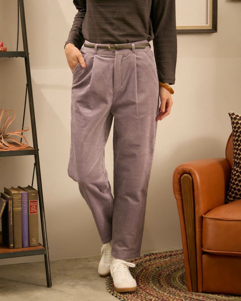 やや畝の目立つ8Wコーデュロイを使用したテーパードパンツです。ウエスト部分は後ろにギャザーを入れ、前はタックを入れていますので、全体にゆとりの有るテーパードシルエットです。前中心ファスナー開きです。 モデル身長: 171 cm 着用サイズ: 61 サイズ Golden Bear Ladies' ボトムス (Ladies') 【着用アイテム】467QC411 タートルネックTシャツ 467QD301 コーデュロイブラウス 467QD431 ロゴプルオーバー 467QD131 洗えるGBキルトジャケット 467QD032 キルト帽子