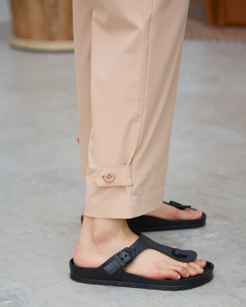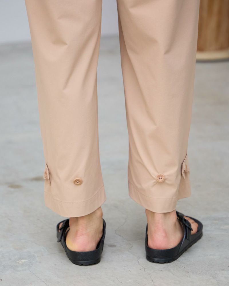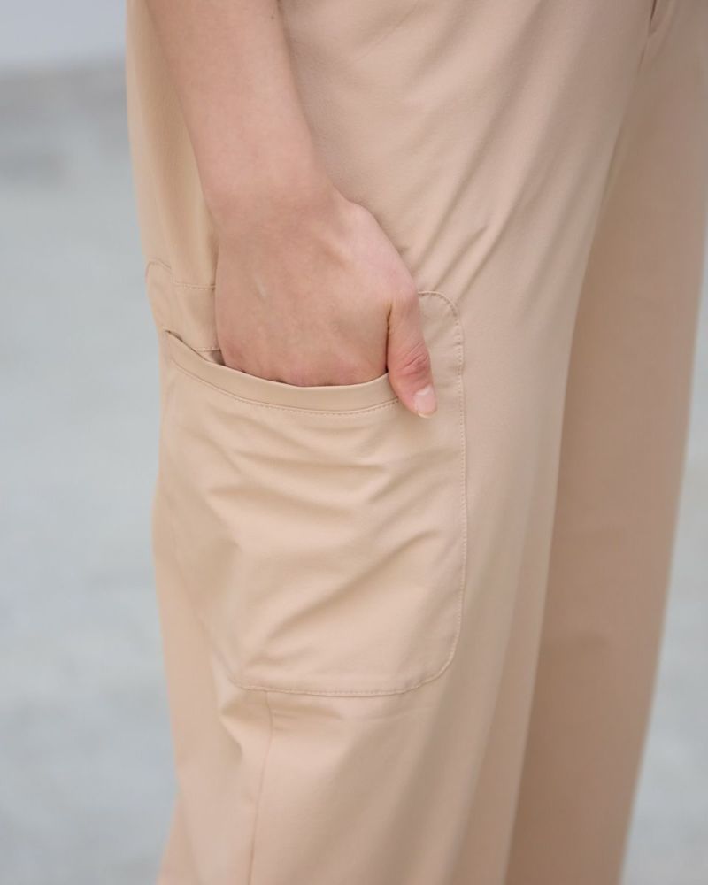軽くて横方向に伸びる素材を使用したカーゴパンツです。全体的にゆったりめのシルエットです。両脇裾に裾巾を調節できるタブが有り、二通りのシルエットを着用頂けます。後ろウエストはギャザーゴム仕様です。色はベージュと肌馴染みの良いピンクの2色展開です。 モデル身長: 167 cm 着用サイズ: 64 サイズ Golden Bear Ladies' ボトムス (Ladies') 【着用アイテム】467R7311 袖デザインブラウス 467R7312 シャドーチェックブラウス 468R7452 2wayカーディガン