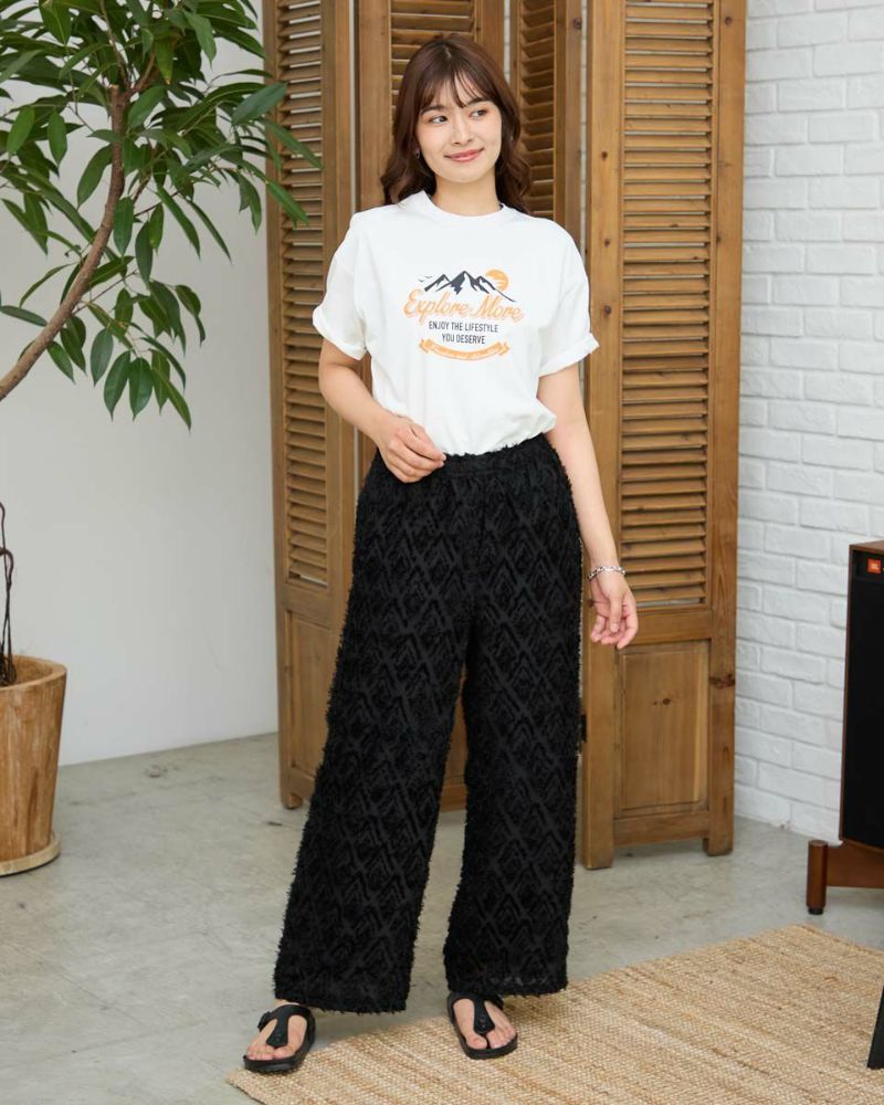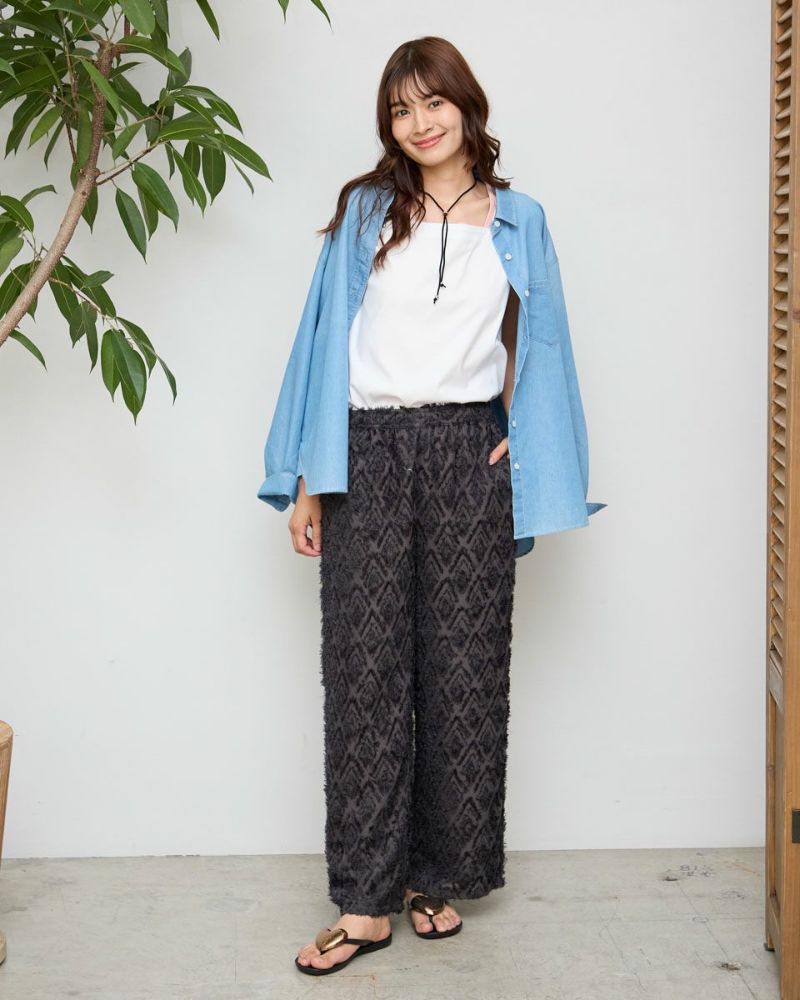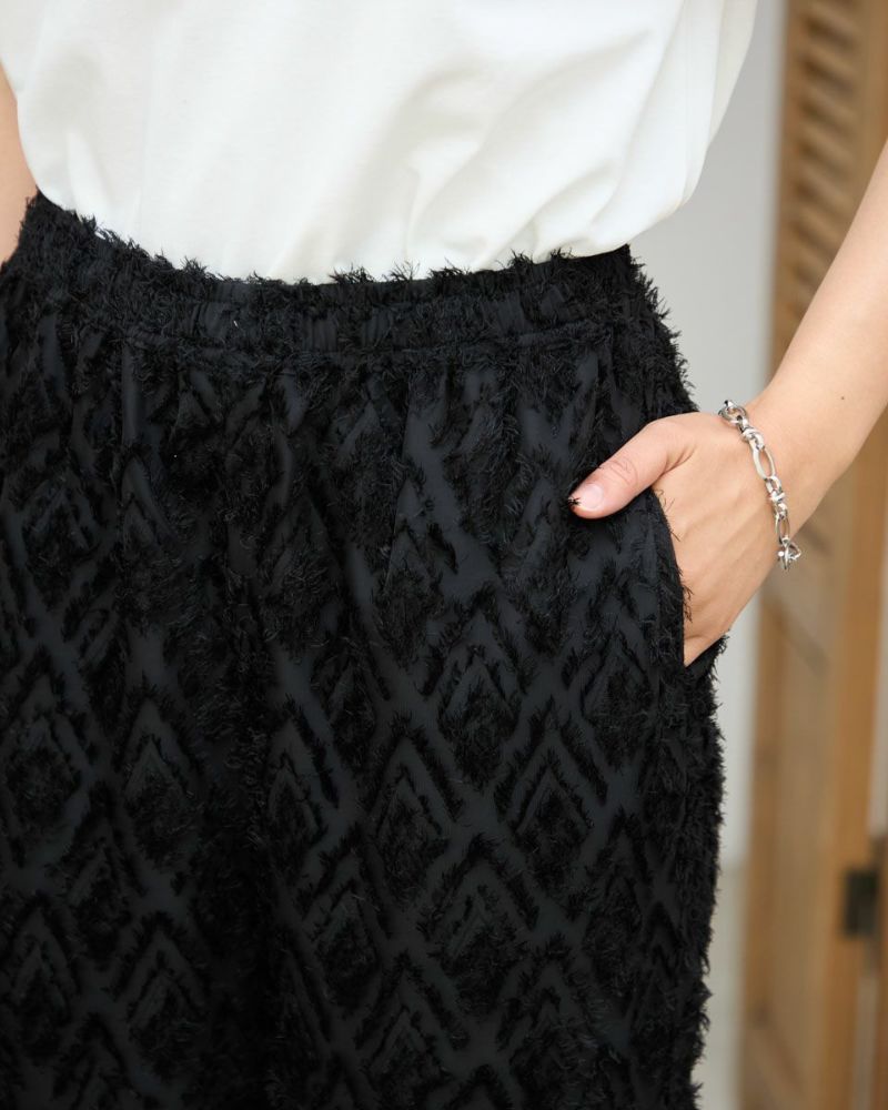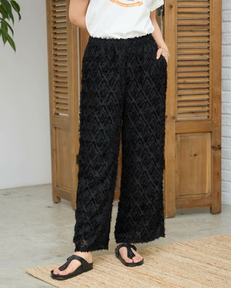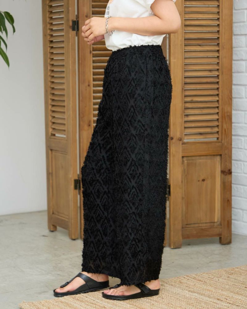 ポリエステル100%のカットジャカードを使用したワイドパンツです。ウエストはファスナー無しで総ゴム仕様です。ウエストの内側に杉綾テープを通していて、裏地が付いています。色はブラックとブラウンの2色展開です。