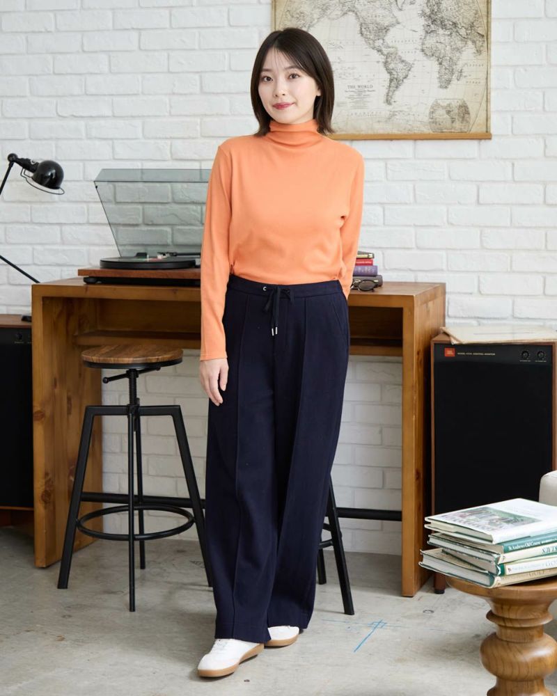 ウール見えのニットパンツです。ウールが入っていないのでチクチクせず、お手入れ簡単です。センターにピンタックを入れることできちんと感を出しつつ足をきれいに見せてくれます。ウエストゴムの仕様で楽ちんきれい見えを叶えてくれるアイテムです。 モデル身長: 168・162 cm 着用サイズ: S サイズ Golden Bear Ladies' ボトムス (Ladies') 【着用アイテム】467RC403 脇ボタンカットソーベスト 467RD101 キルトショートジャケット 467RE303 ストライプシャツ 468RC460 タートルネックリブTシャツ 468RD353 デニムシャツ