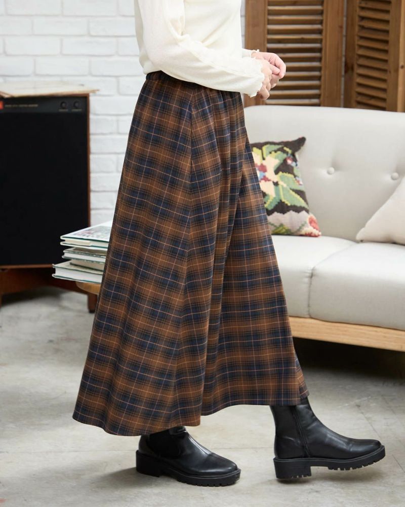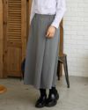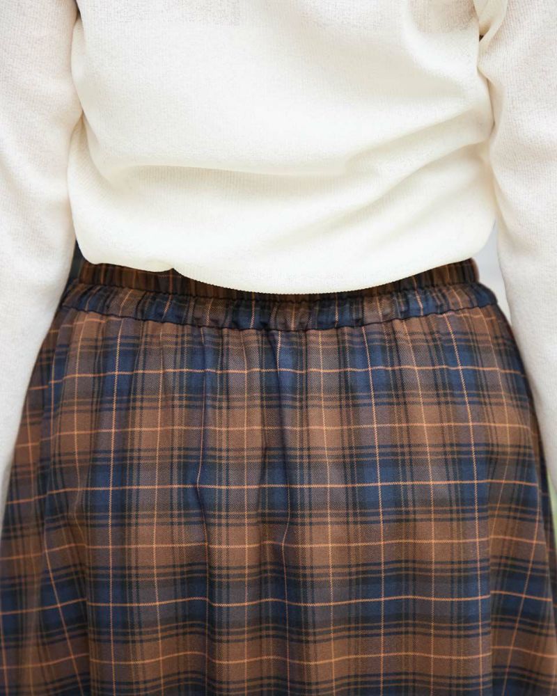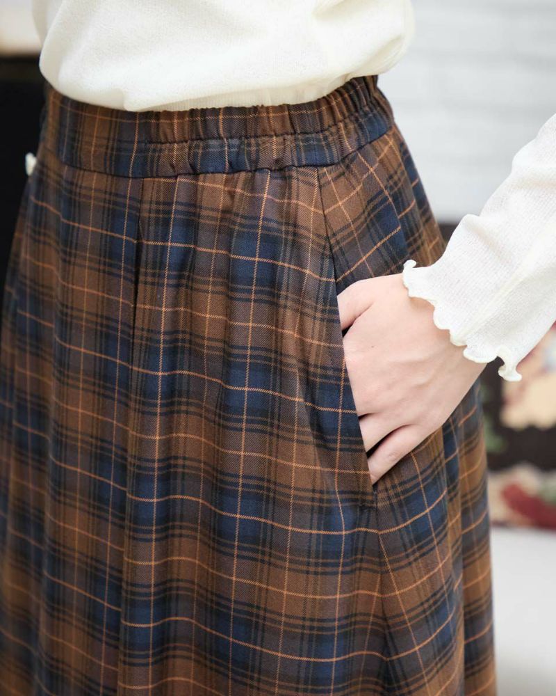 ポリエステル,レーヨン,ポリウレタンのフレアスカートです。前ウエストの脇から後ろウエストに平ゴムを入れています。ファスナー無しでらくにはくことができる仕様になっています。左前に深くタックを取りました。
