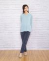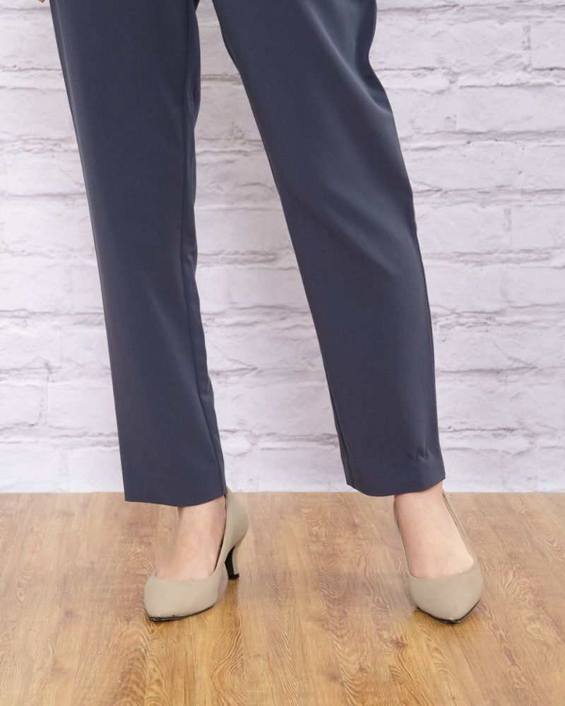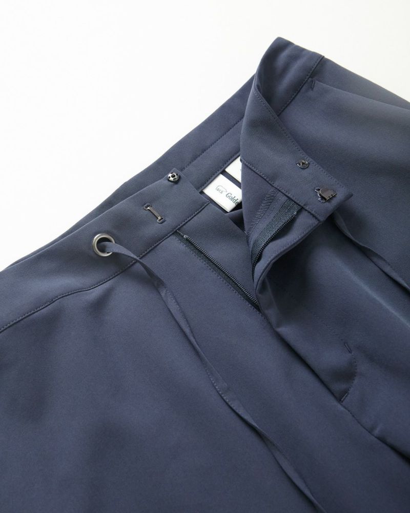 少し細身なシンプルなテーパードパンツです。落ち感のある素地がスタイリッシュで、上物をウエストインした時、紐を通したはと目がおしゃれで軽快な印象を与えます。さらっとしていて着こなしを綺麗に見せてくれるパンツです。