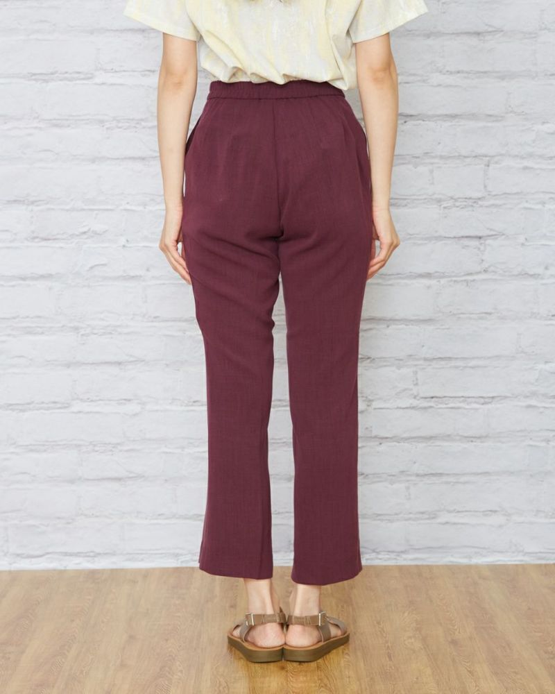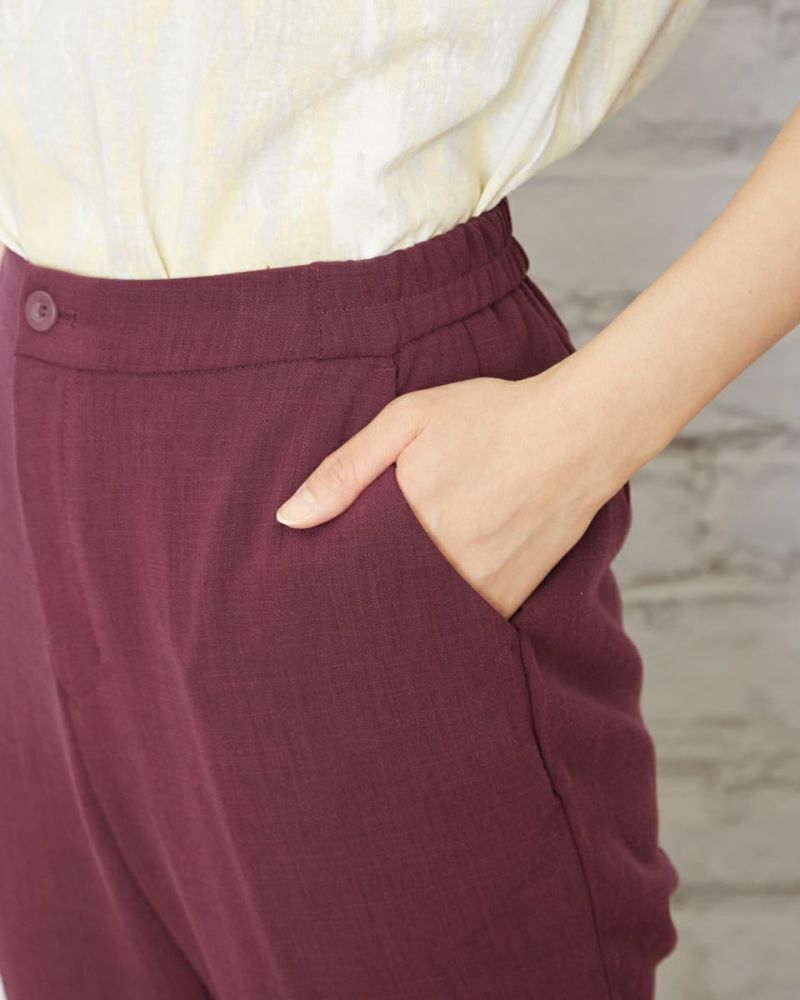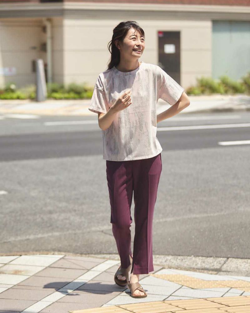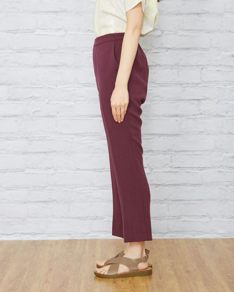 ヨコ方向に、ほどよくテンションのある生地を使用。生地表面に細かく節目が走り合繊ながら見た目も夏らしい1本です。後ろベルトは平ゴムを通した仕様、フロントはタックを取らずシンプルな見た目にしています。 膝のあたりの筒幅を少し狭めたセミフレアのシルエットにセンタープレスをかけ、よりクールに仕上げました。468H6451のチュニックを合わせたオフィススタイルも素敵です。パープルとネイビーの深いカラー展開のため暑さの残る9月頃まで着用可能。足首が少し覗く丈でフラットシューズやサンダルとの相性も抜群。旬のコーデが楽しめる1本です。"