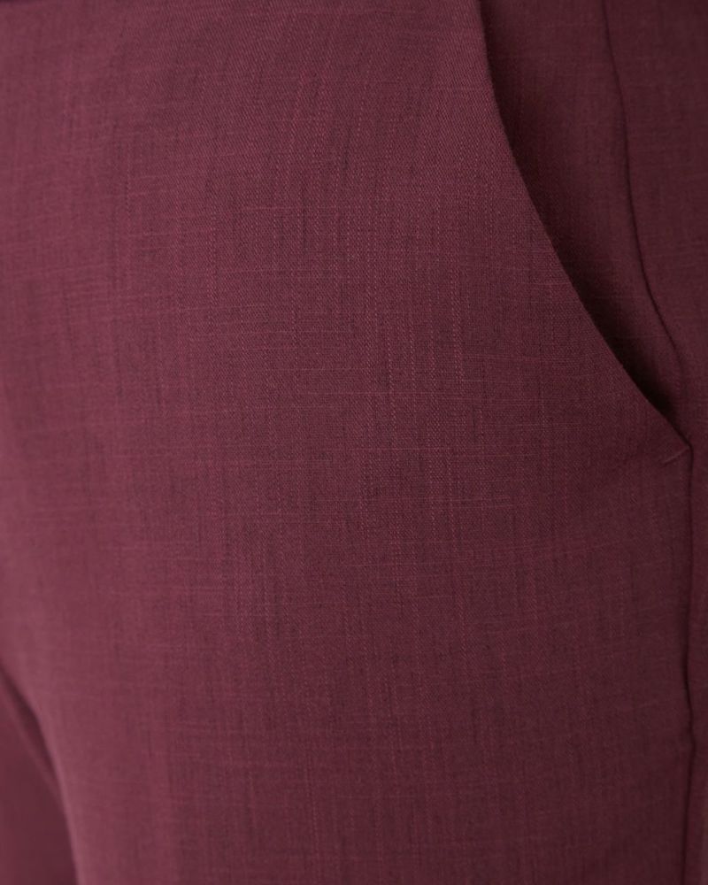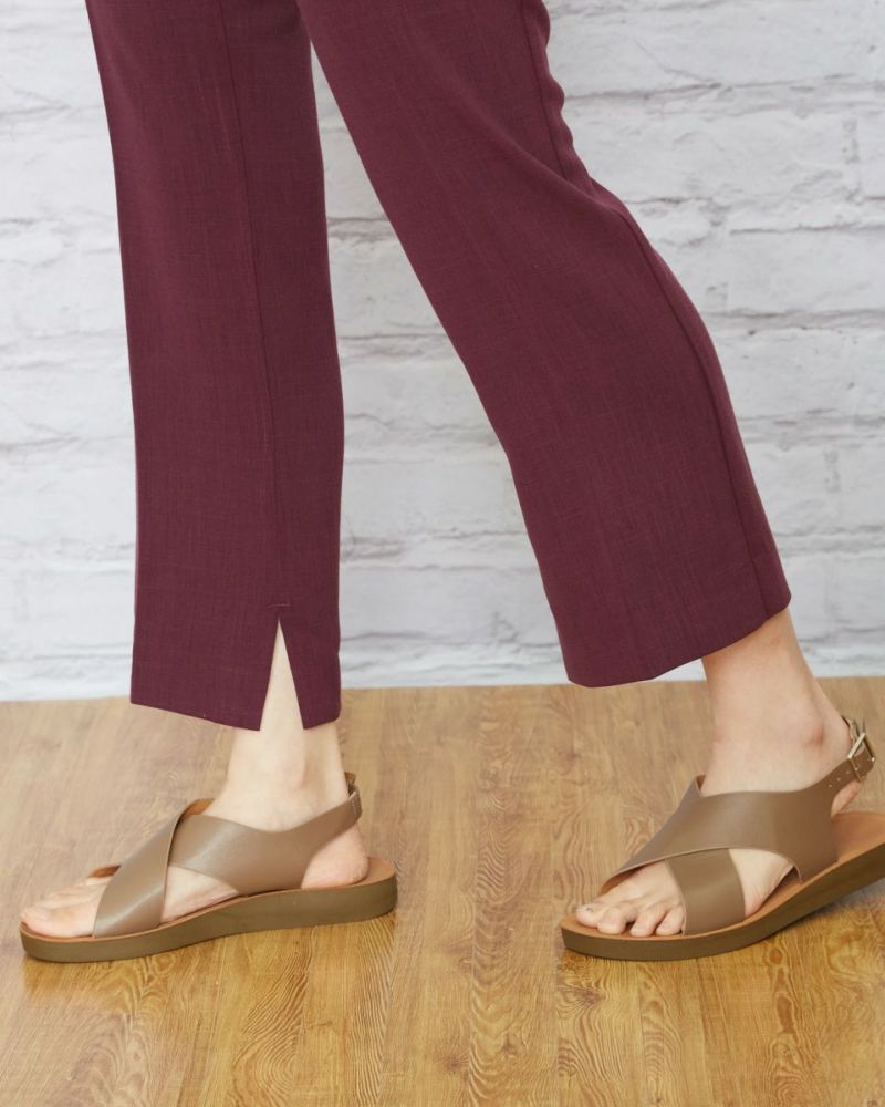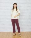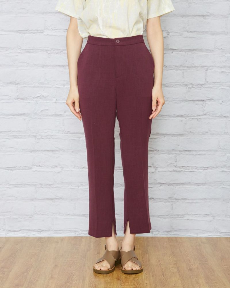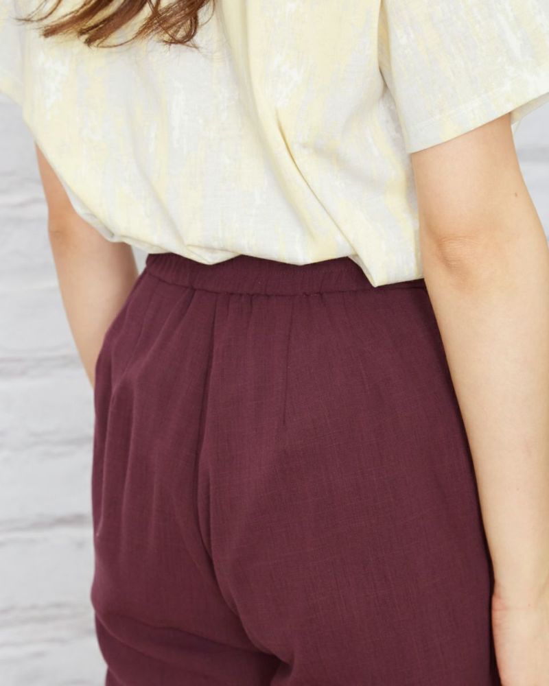 ヨコ方向に、ほどよくテンションのある生地を使用。生地表面に細かく節目が走り合繊ながら見た目も夏らしい1本です。後ろベルトは平ゴムを通した仕様、フロントはタックを取らずシンプルな見た目にしています。 膝のあたりの筒幅を少し狭めたセミフレアのシルエットにセンタープレスをかけ、よりクールに仕上げました。468H6451のチュニックを合わせたオフィススタイルも素敵です。パープルとネイビーの深いカラー展開のため暑さの残る9月頃まで着用可能。足首が少し覗く丈でフラットシューズやサンダルとの相性も抜群。旬のコーデが楽しめる1本です。"