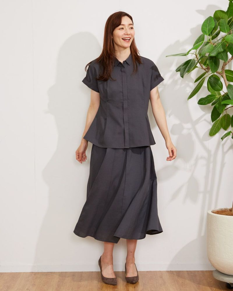 優雅な大人のミモレ丈。フレアが揺れ、はくだけで上品さが纏えるスカート。ほのかなシャリみと糸の節目が涼やかな麻調の素材をセレクト。同素材の468JA350ブラウスとセットアップでの着用も可能です。本体を4枚に接ぎ、接ぎ目に細くピンタックを取って凹凸を付けているため縦ラインが活きプリーツのような雰囲気が特徴です。着脱に便利なプルオンタイプで安心の裏地付き。パールや華奢なアクセサリーが似合うエレガントさもありますが、Tシャツにフラットサンダルやカゴバックを合わせたフェミニンカジュアルな着こなしも可愛くておすすめです。