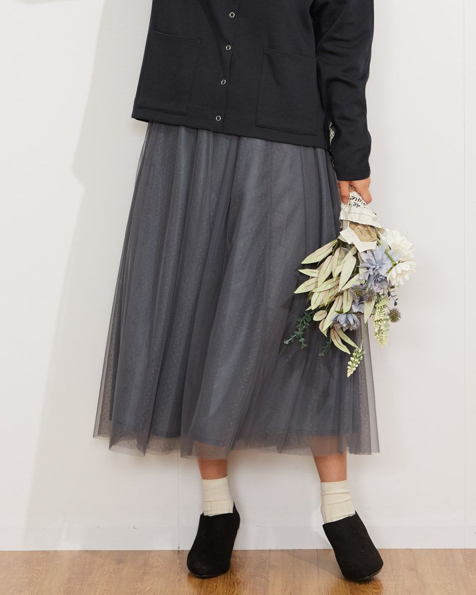 ふわっと広がるチュールが華やかなスカートです。ドット柄のチュールを中間に、表のチュールから、かすかにドットの陰影が見え隠れする様子が大人っぽくて素敵な1着です。しっかりと裏地が付いている為、透けを心配することなくお召しいただけます。足を覆うミモレ丈でチュールに動きが出るためブーツを合わせても足元が重くなりすぎません。ジャケットやカーディガンを合わせてオフィス仕様にしたりパーカやダウンベストとミックスしてもチュールの持つ女性らしさで砕け過ぎず綺麗めカジュアルに仕上がります。