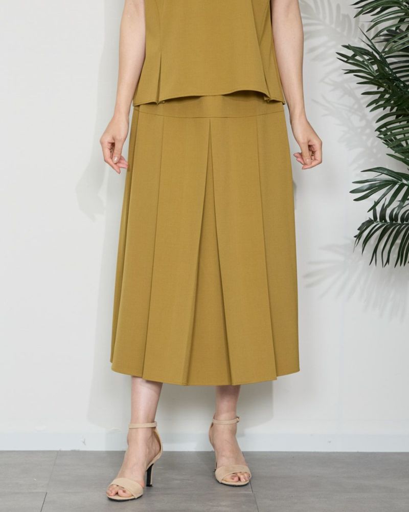 足の肌露出が気になる大人世代に嬉しいミモレ丈のスカート。ヒップラインより下にプリーツを施しているため、ウエスト部分の生地溜まりも無くゴム仕様でスムーズにお召しいただけます。広幅のプリーツがゆったりと揺れ、優雅でスクール感が無く同素材の468QA350のブラウスとセットアップでの着用もおススメです。