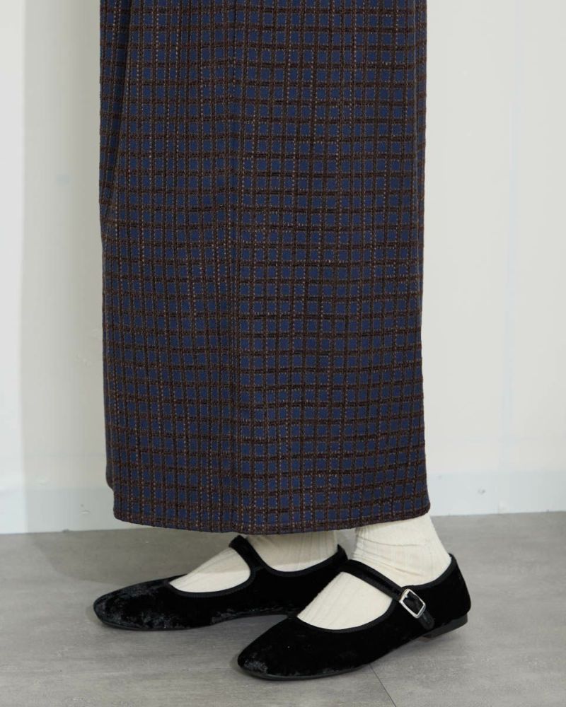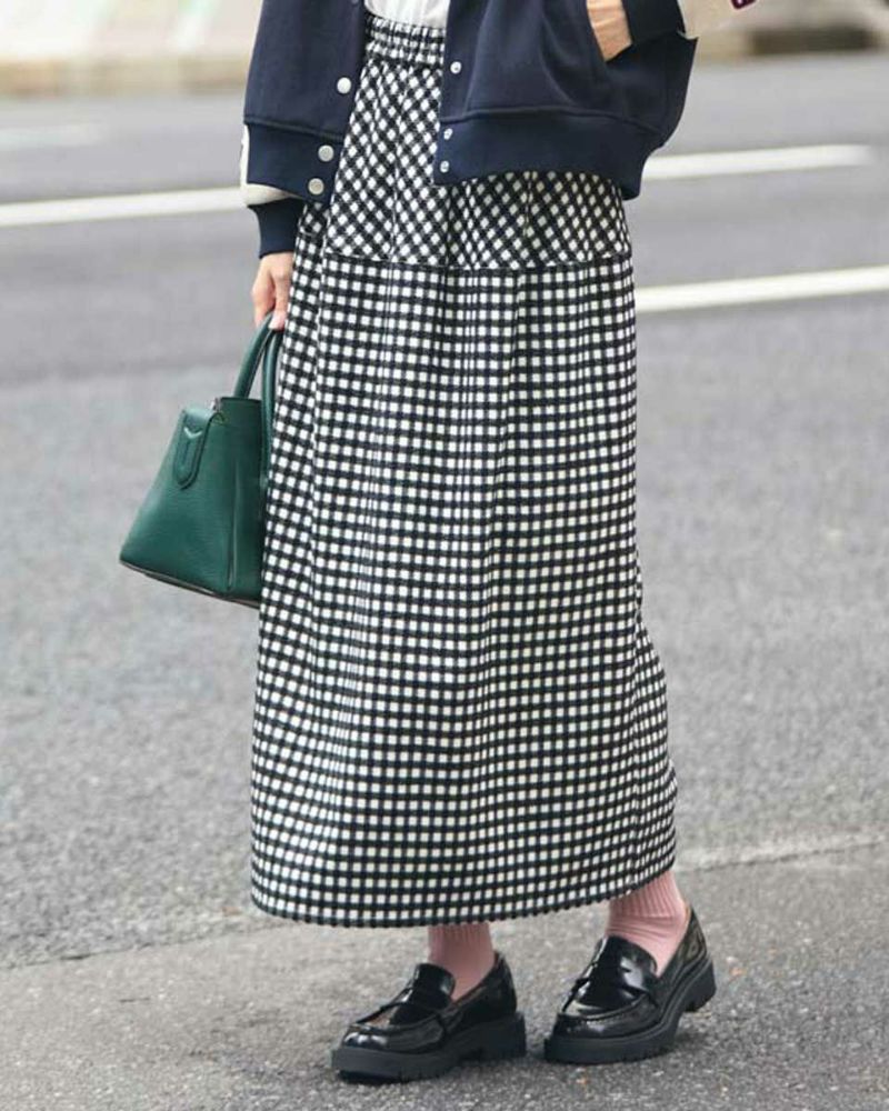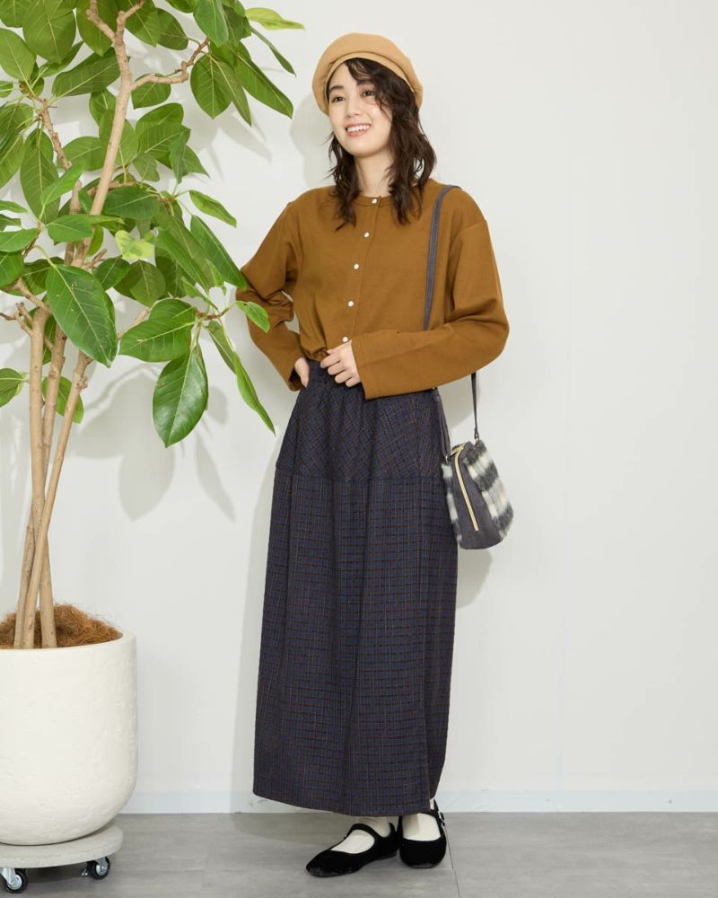 丸みを帯びたシルエットが裾に向かってすぼまっていくバルーン型のスカート。格子柄で可愛さのある生地ですがミモレ丈で足を隠した姿が聡明な品の良さも感じる1着になっています。着脱に便利な総ゴム仕立て。裏地が付いているのでタイツとの摩擦も無くお召しいただけます。8mmほどの格子部分にはプクプクとした凹凸が可愛いモール糸を使っているため温かみも感じ表情豊かな風合いが魅力になっています。トップスはスウェットでカジュアルダウンすると可愛いです。パンプスやブーツとの相性も抜群です。 モデル身長: 166 cm 着用サイズ: M サイズ Golden Bear White Label (Ladies') ボトムス (Ladies') 【着用アイテム】467QC402 ロゴTシャツ 467QC430 カット羽織り 467QD434 スタジアムジャンパー 468QD751 スカート 467QC002 ショルダーバッグ