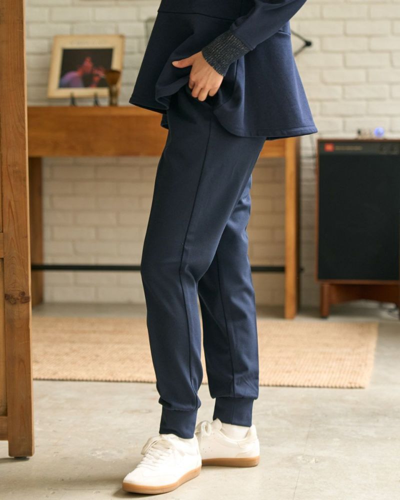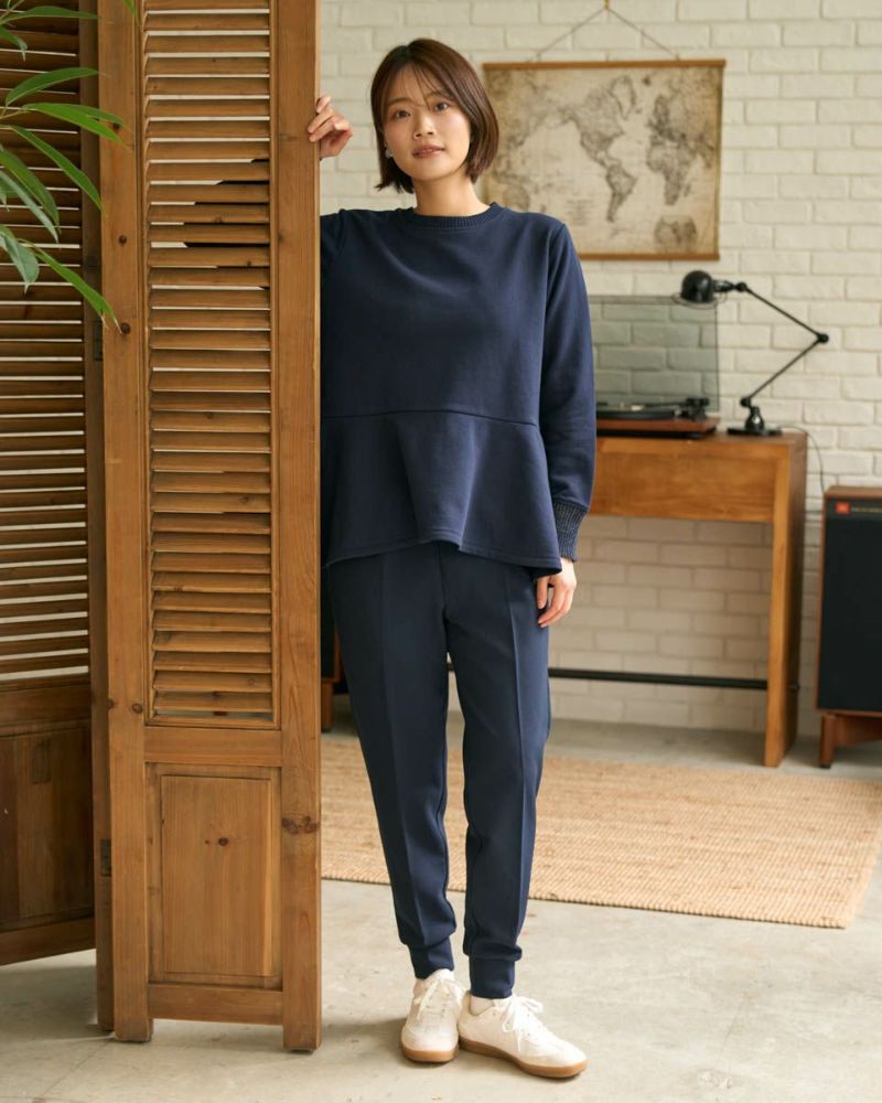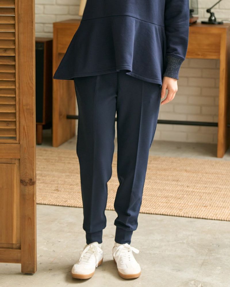生地表面に細かいシボがあり上品なカットソージョーゼットをセレクト。裏面に薄く起毛をかいているため肌当たりもソフトで気温の下がる季節におすすめ。裾を切り替え絞ったシルエットのジョガーパンツでウエストは着脱が便利なゴム仕様。センタープレスの加工で砕け過ぎず綺麗めにお召しいただけます。同素材の468QD361ブラウスとのセットアップはもちろん、ジャケットからローゲージニットまでトップスを選ばない万能パンツです。スニーカーの他、レザーのパンプスやブーツとの相性もよくオフィスや送迎での着用に使えて便利です。