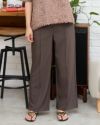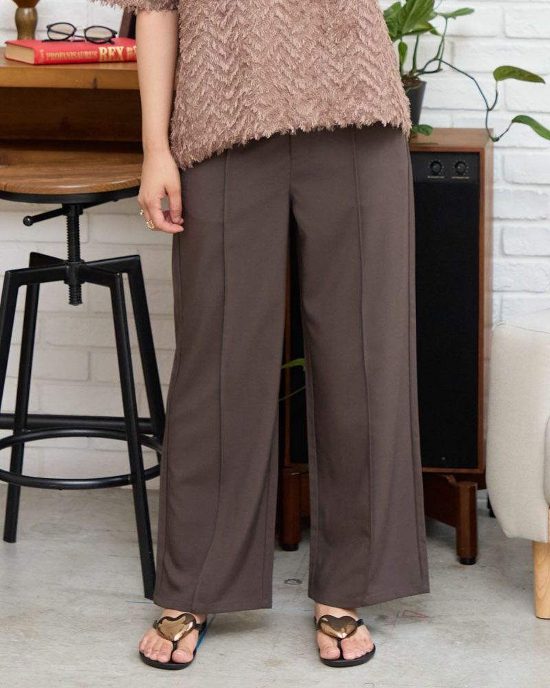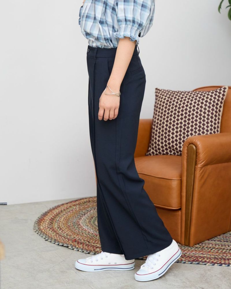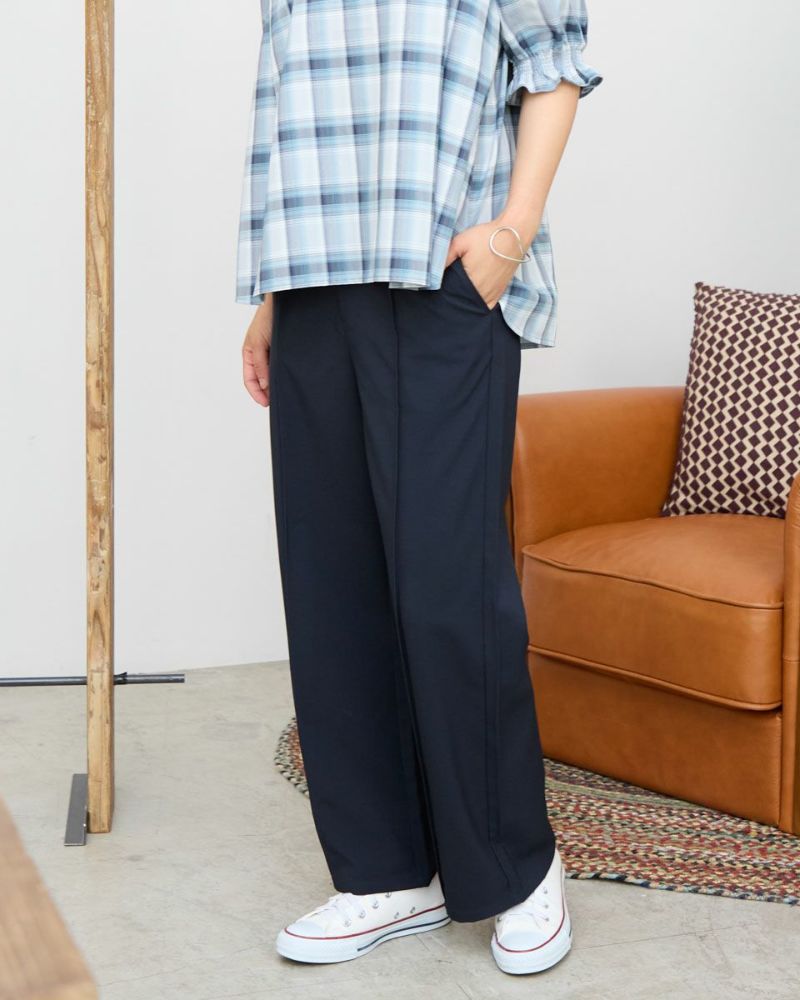 程よく弾力のあるダブルフェイス調の生地は身体の肉感を拾わずダレ感もないためはき心地もスッキリなストレートのシルエットです。ピンタック状にステッチをかけたセンタープレスの効果で足が真っすっぐに映る点も嬉しいポイント。ほのかに光沢がありキレイ見えするためオフィス使いにもおすすめ。フロントZIPやベルトループを施したハンサムなディティールですがフェミニンなトップスや短丈アイテムとも相性がよく、今期ならベルトを使いウエストにポイントを置いた着こなしも素敵です。トレンドのブラウンカラーは洒落て見える同系色のトップス(ボルドーやコゲチャ)合わせがおすすめです。