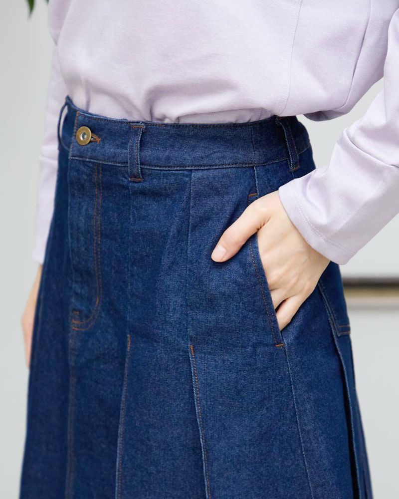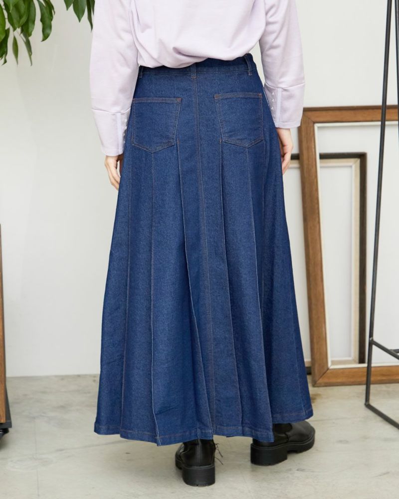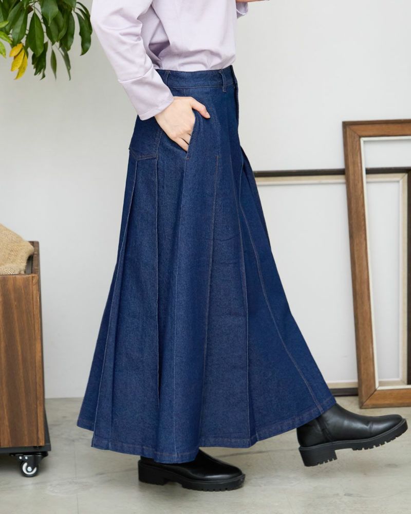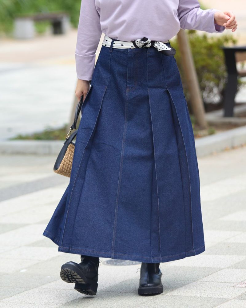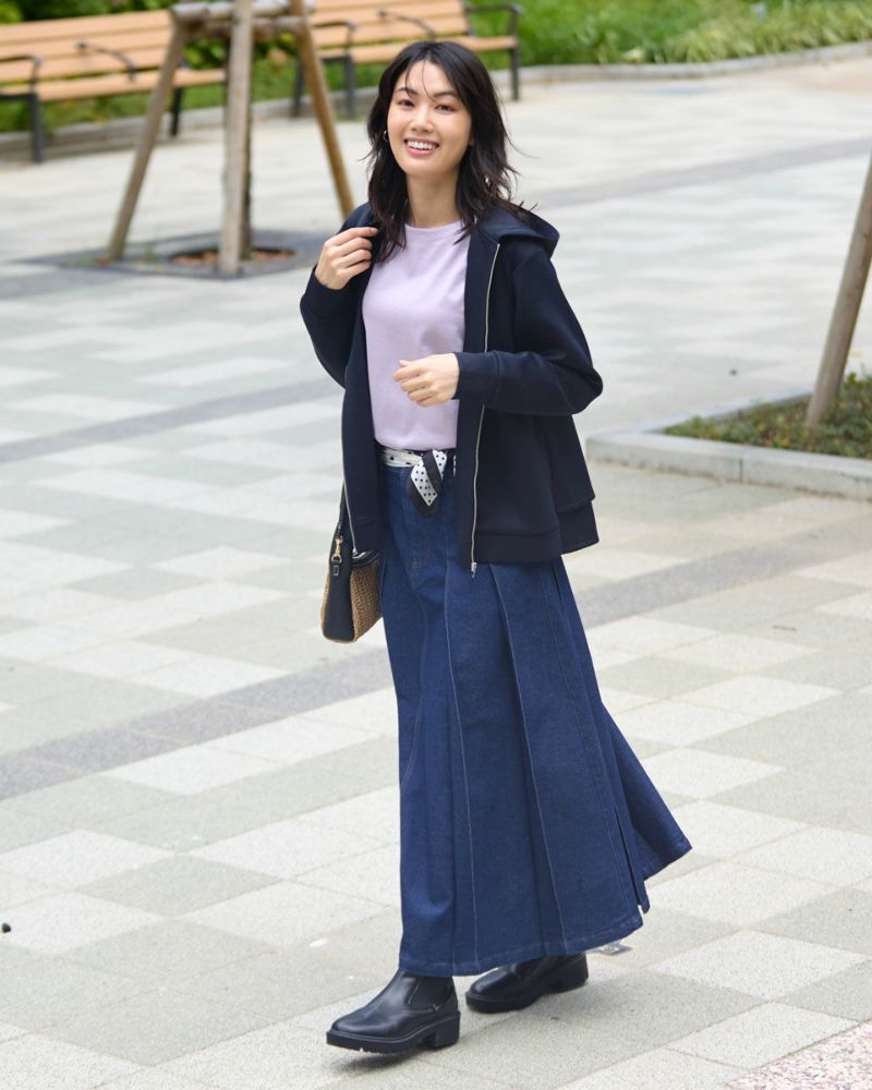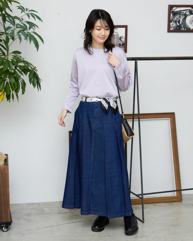 ヨコ糸に伸縮性のある糸を用いたデニムを使用。ほどよい厚みはシルエットが崩れにくく、下着のラインもひびきにくい事など女性にとっても嬉しい点が多い8.5オンスをセレクト。腹部から裾へ施された太い幅のプリーツがポイントです。ミモレ丈でプリーツがゆっくりと揺れる様子はスクール感が薄れ、カラーソックスやローファーを合わせたトラディショナルなスタイルも上品にまとまります。ブラックカラーはモード感があるため、ブーツで足元に重心を置いたスタイルも素敵です。トレンドの短丈アウターとも相性も抜群です。 モデル身長: 166 cm 着用サイズ: 64 サイズ Golden Bear White Label (Ladies') ボトムス (Ladies') 【着用アイテム】468RC450 クルーネックプルオーバー 468RC451 ラッフルパーカ 468RC460 タートルネック 468RC650 シャギーニットプルオーバー 468RC160 ショートジャケット 468RC751 デニムスカート