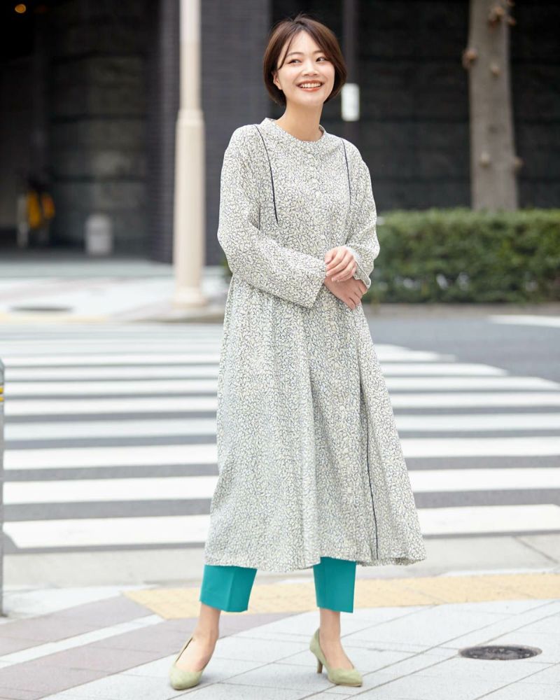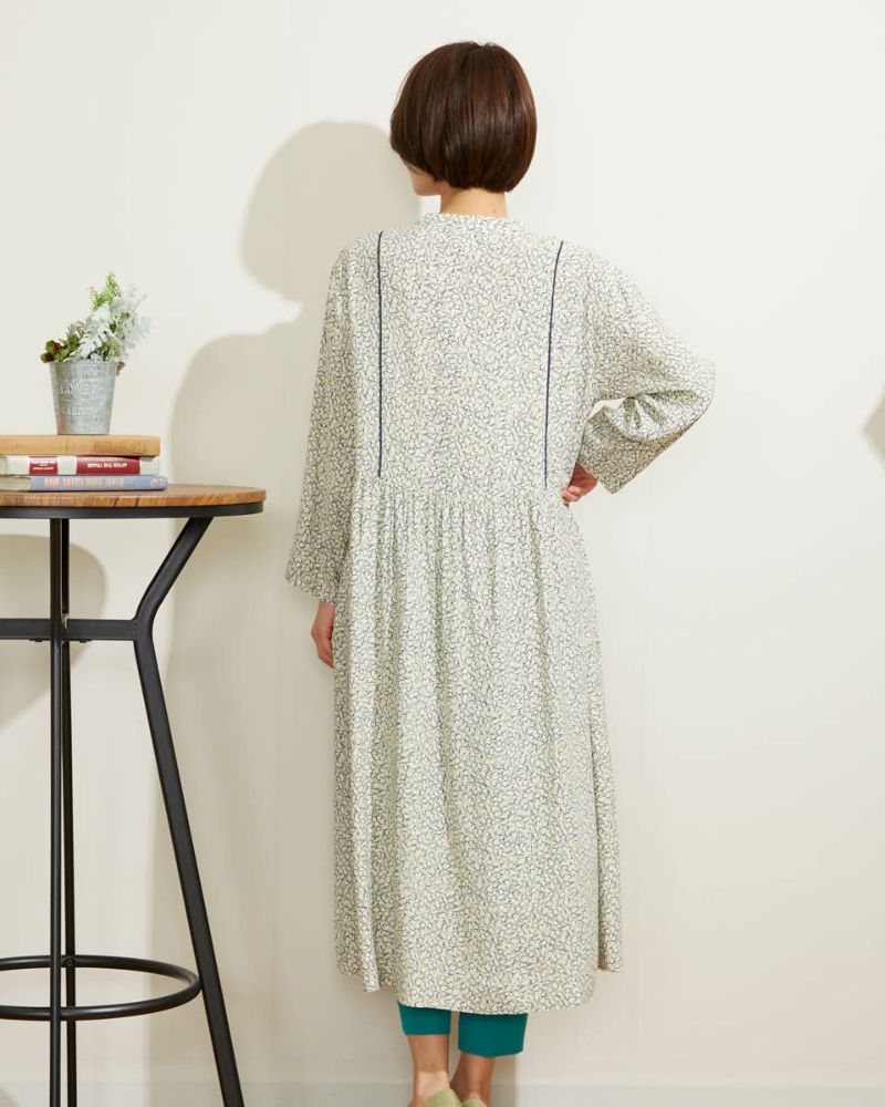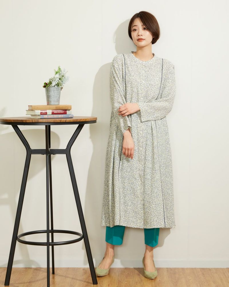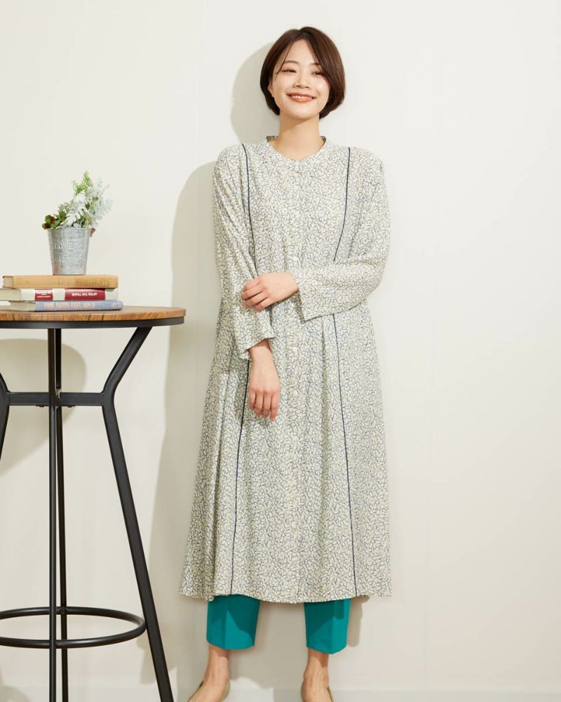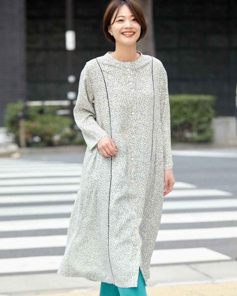 花柄の総プリントとシックなネイビーの2色展開のワンピースです。脇と後ろに入れたギャザーがふんわりと、パイピング使いもメリハリがつき程よいアクセントに。前開きなので羽織としても使用でき、大人が取り入れやすいアイテムに仕上げています。 モデル身長: 167 cm 着用サイズ: M サイズ Golden Bear Ladies' ブラウス (Ladies') 【着用アイテム】468Q1750 ツータックテーパードパンツ 467Q3003 合皮バッグ