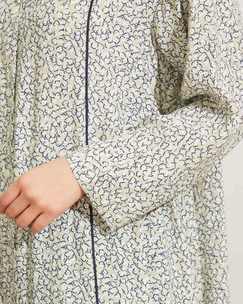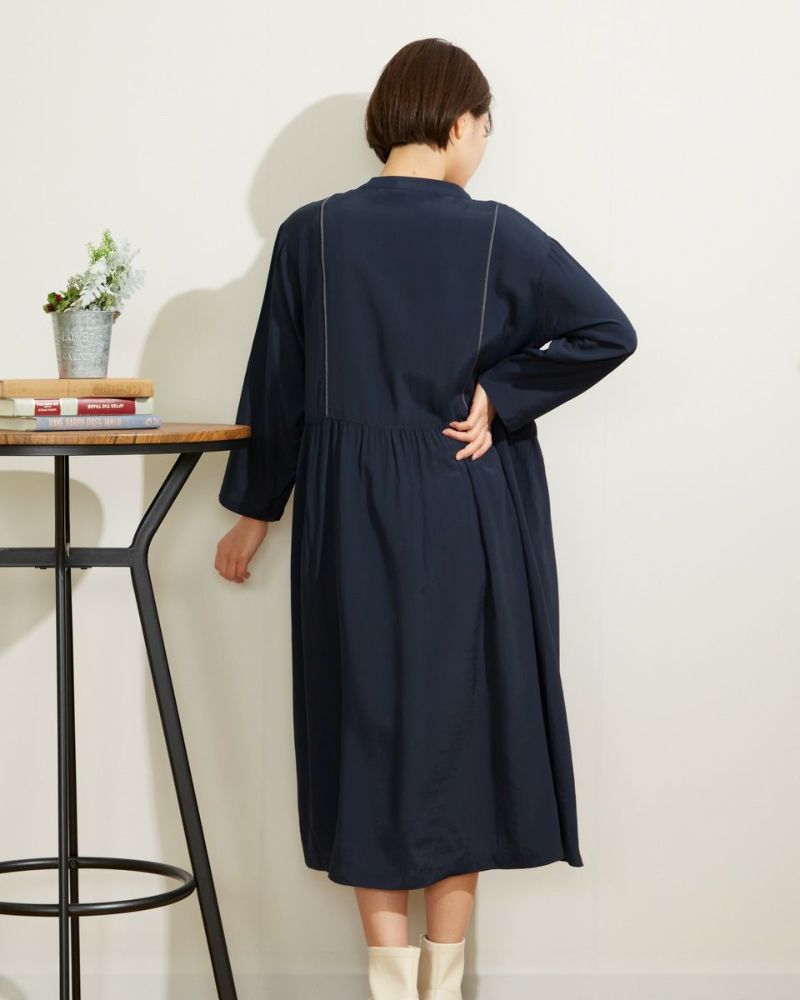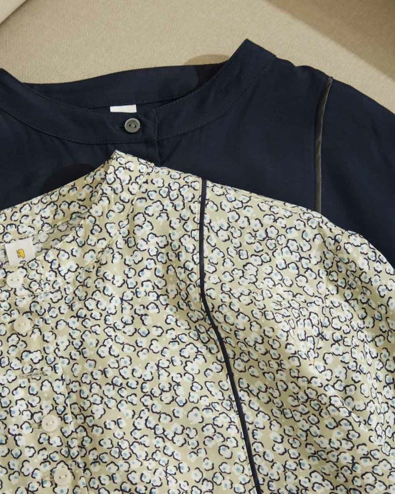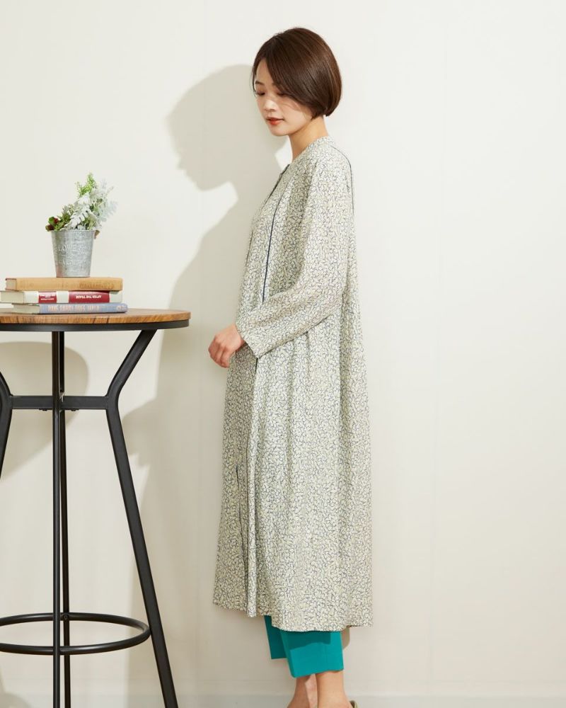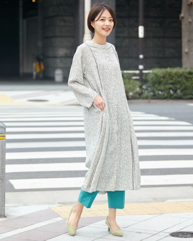 花柄の総プリントとシックなネイビーの2色展開のワンピースです。脇と後ろに入れたギャザーがふんわりと、パイピング使いもメリハリがつき程よいアクセントに。前開きなので羽織としても使用でき、大人が取り入れやすいアイテムに仕上げています。 モデル身長: 167 cm 着用サイズ: M サイズ Golden Bear Ladies' ブラウス (Ladies') 【着用アイテム】468Q1750 ツータックテーパードパンツ 467Q3003 合皮バッグ