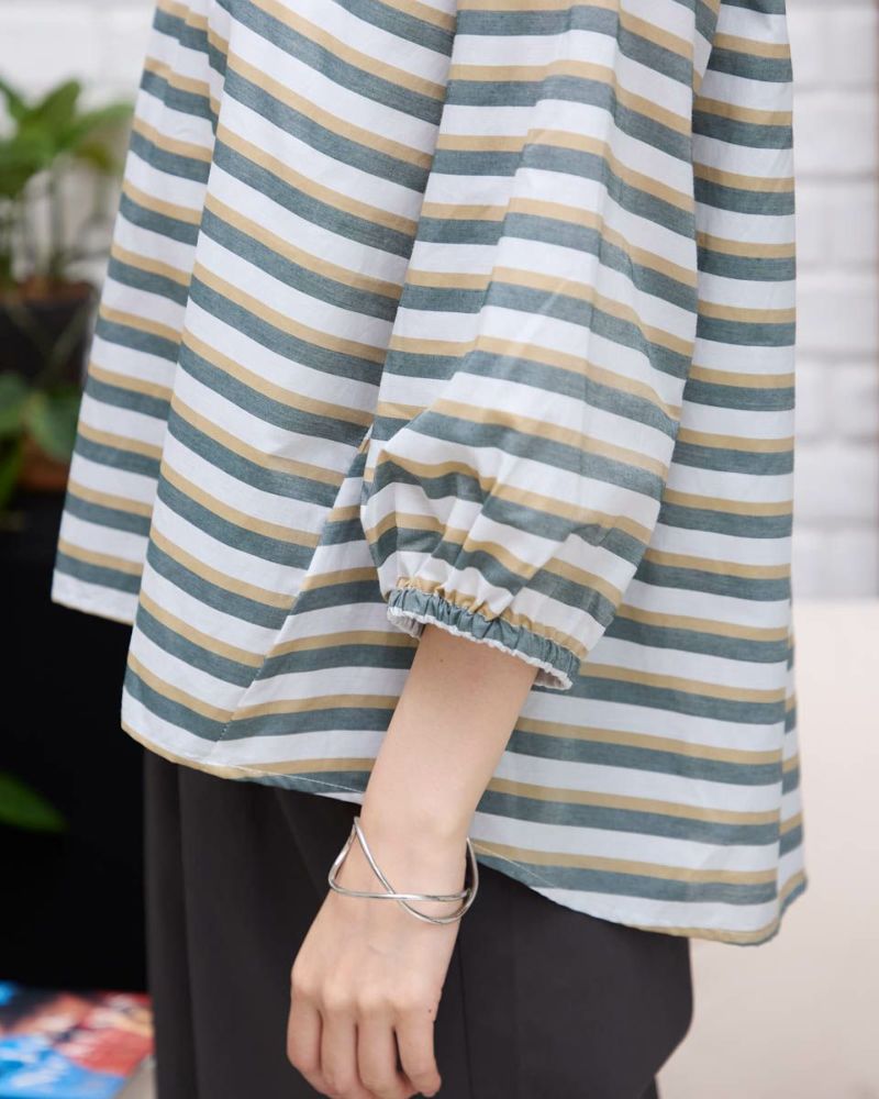 透け感が涼しげな、シースルーボーダーブラウス。軽やかな素材を使った、ゆったりシルエットのプルオーバーブラウス。胸元はボタン開きで、着脱もしやすいデザインです。体のラインを拾わないリラックス感のある着心地で、暑い季節も快適に。