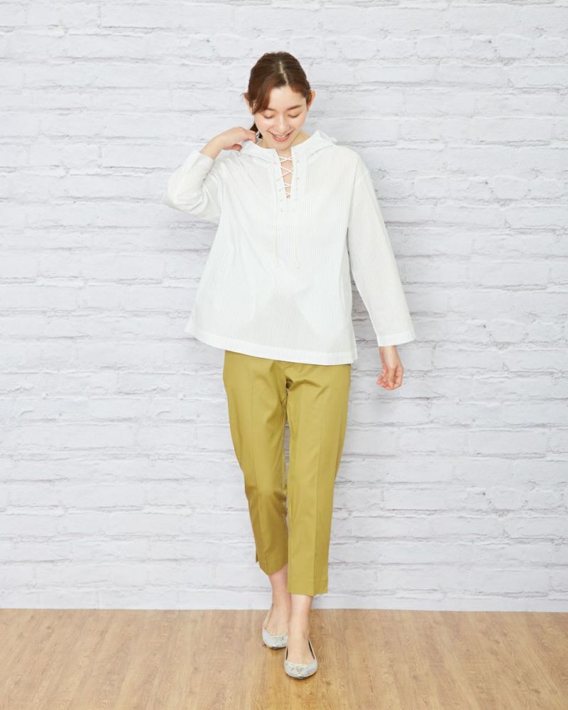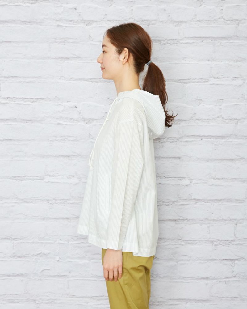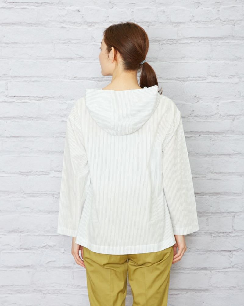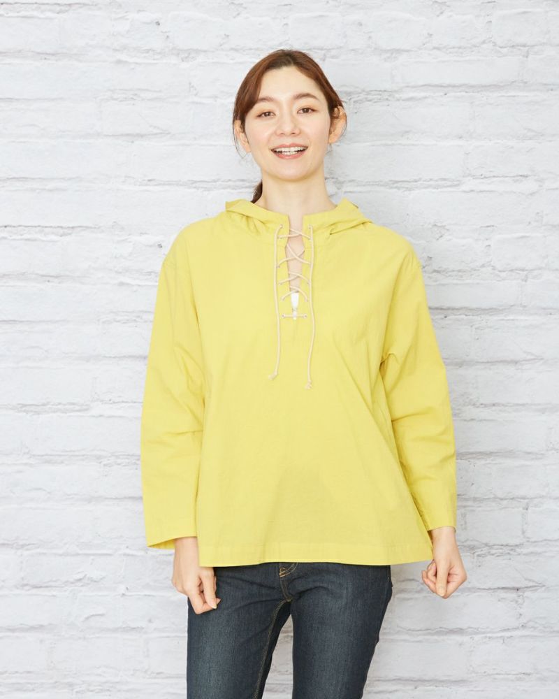 ヤッケをイメージした被りのブラウスで、フードとフロントの編み上げがポイント。