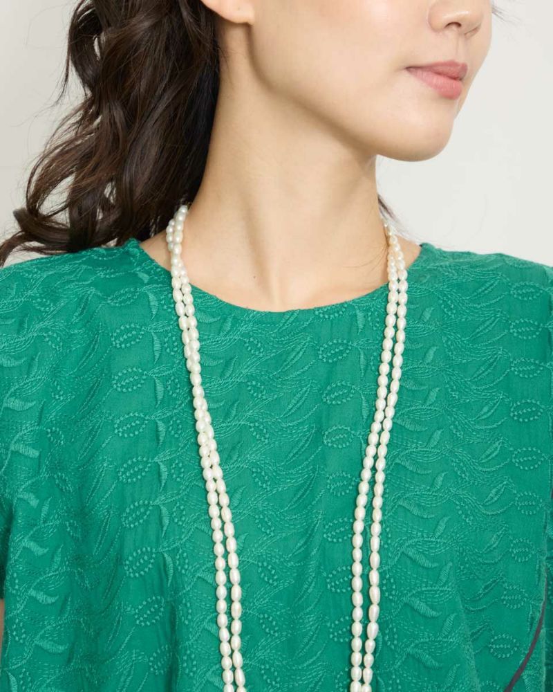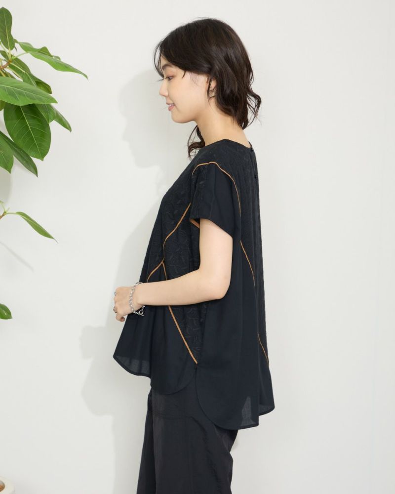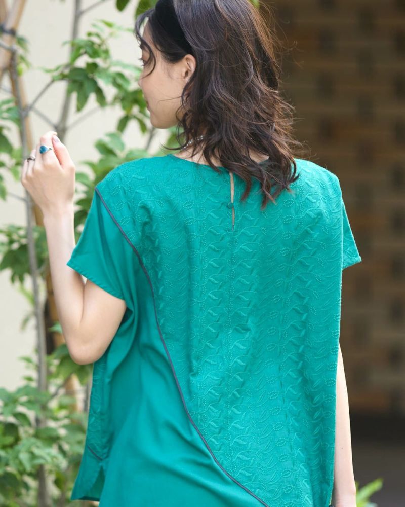 生地表面の細やかな凹凸がナチュラルで優しいコットンの生地です。伸びやかなツルが印象的な草花を表現した刺しゅうを施し、無地とブロッキングしたデザインブラウスです。暑い日差しに負けない黒と強いグリーンのボディは、晩夏まで使えメタルやビーズのアクセサリーと好相性。ボトムスを変化させオン・オフでお召しいただけます。 モデル身長: 166 cm 着用サイズ: M サイズ Golden Bear White Label (Ladies') ブラウス (Ladies') 【着用アイテム】468QA751 イージーパンツ 468QB751 ベイカー風イージーパンツ