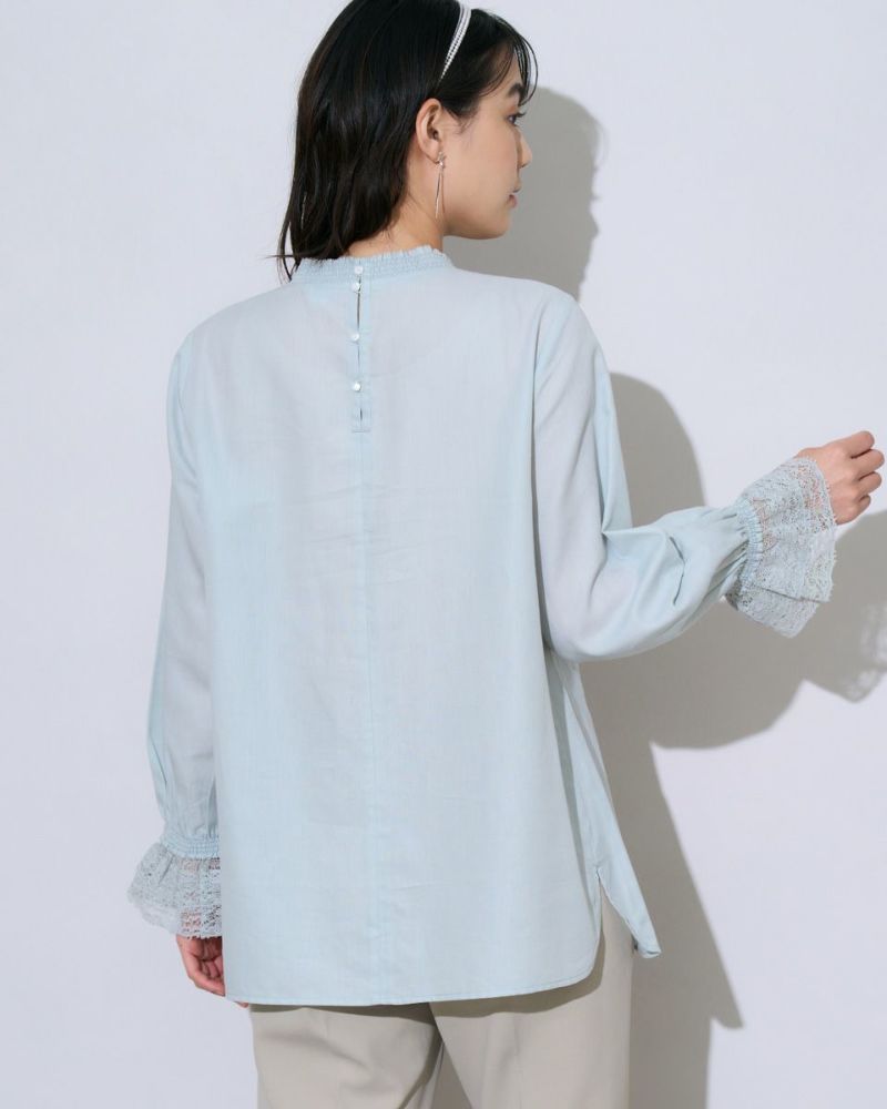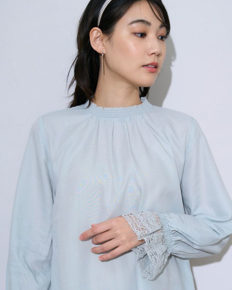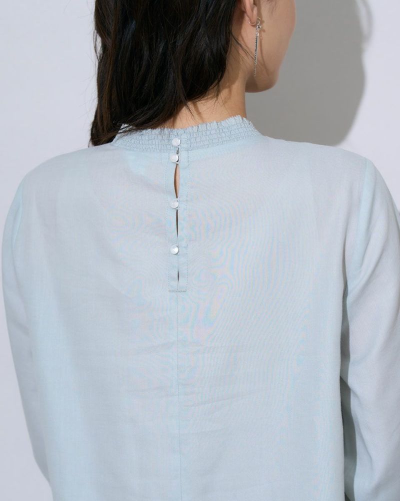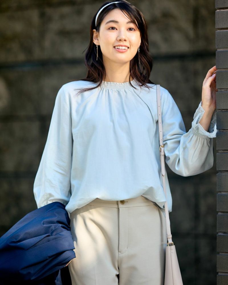 細かくツイルに織られた生地は、ほのかに光沢もありナチュラルすぎないところが魅力。滑らかですが身体のラインを拾いすぎないソフトタッチな被りのブラウス。少し立ち上げた襟と袖口に施したシャーリングで生地に立体感が足され華やかさも一緒に纏えるアイテム。ジャケットやカーディガンとの相性も良く、オフィス使いにおすすめ。優しい春カラーでパールを添えて謝恩会など親しい方とのパーティでお召しになっても素敵です。 モデル身長: 166 cm 着用サイズ: M サイズ Golden Bear White Label (Ladies') ブラウス (Ladies') 【着用アイテム】468R1150 ショートトレンチコート 468R1750 ストレートパンツ 468R2750 テーパードパンツ